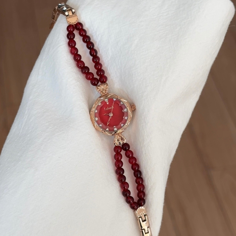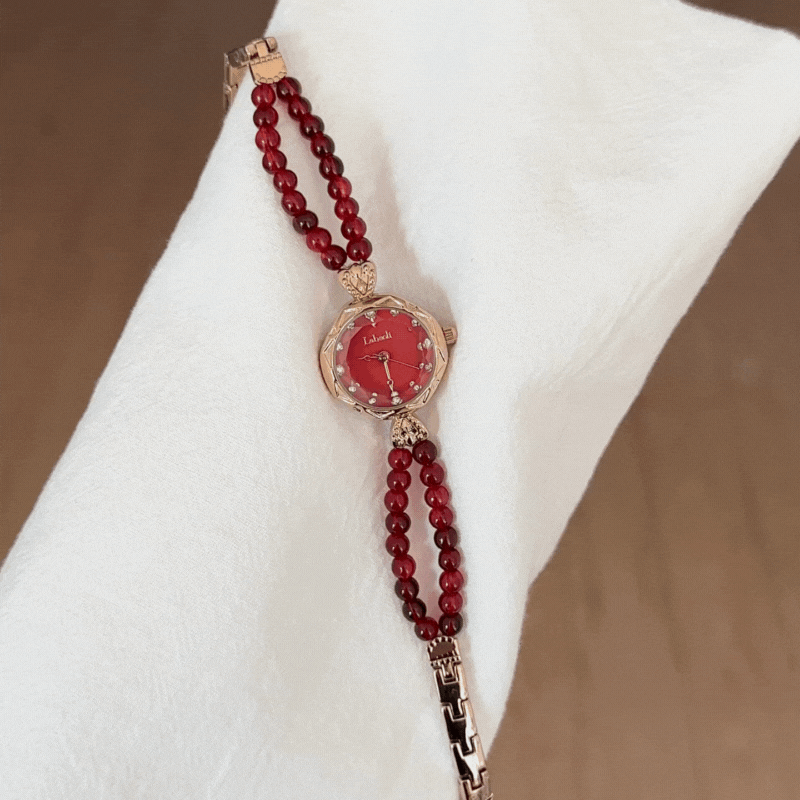 The Elegant Glamour Watch radiates refined sophistication and feminine charm. Featuring a red pearl-beaded bracelet strap, a matching red round dial, and a gold-tone case, this timepiece embodies luxury in every detail. Designed for women who love to stand out gracefully, it blends vintage elegance with a modern statement look—perfect for both formal occasions and everyday chic.