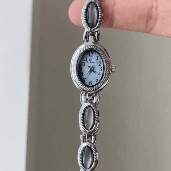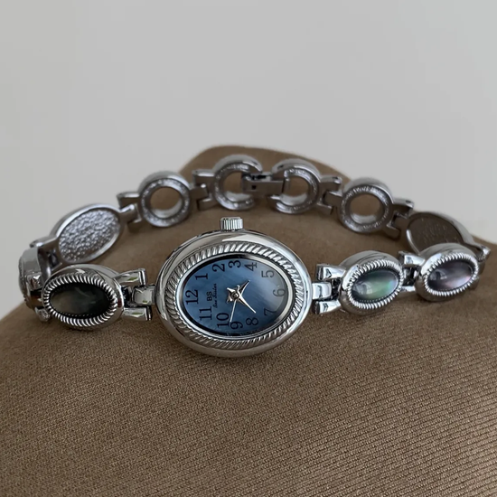 Ovaj elegantni ženski kvarcni sat uparuje... tanka srebrna narukvica s nježno ovalni brojčanik, izrađen od sivo-plava sedefasta koji se mijenja sa svjetlošću. Uokviren svjetlećim intarzije od školjke ušnog uha, evocira mirnu tajanstvenost mora i dodaje dašak prirodne gracioznosti svakodnevnom stilu.
