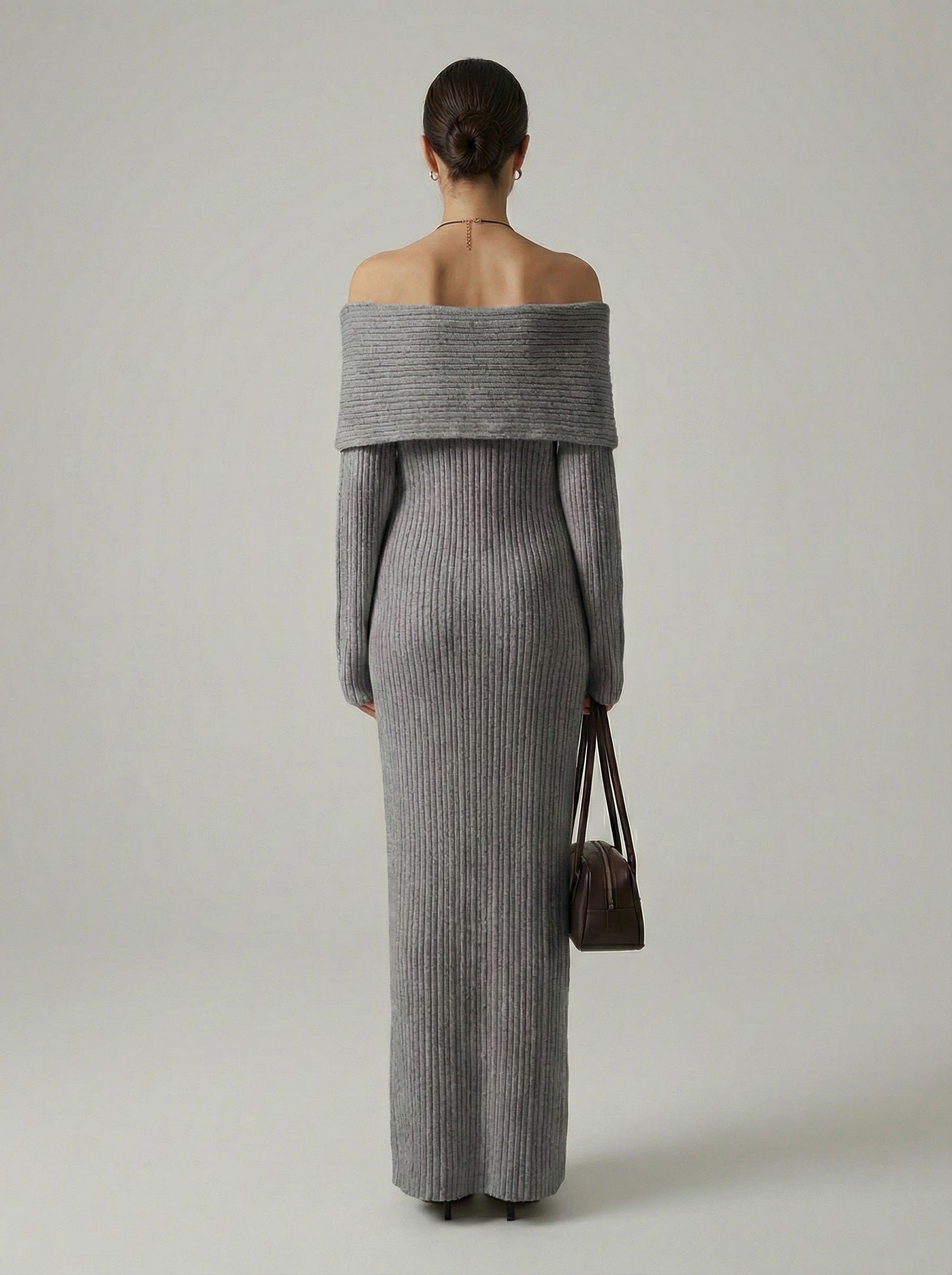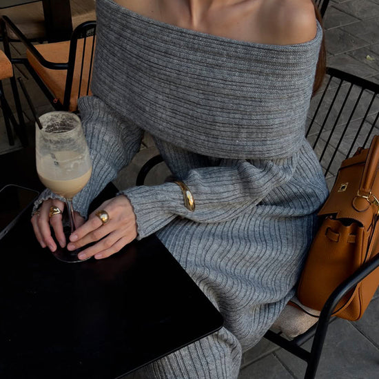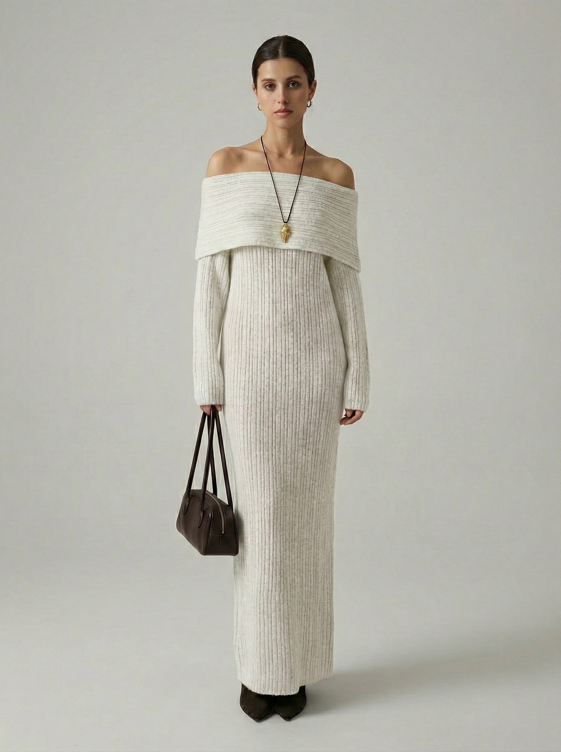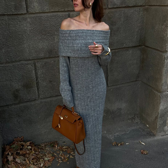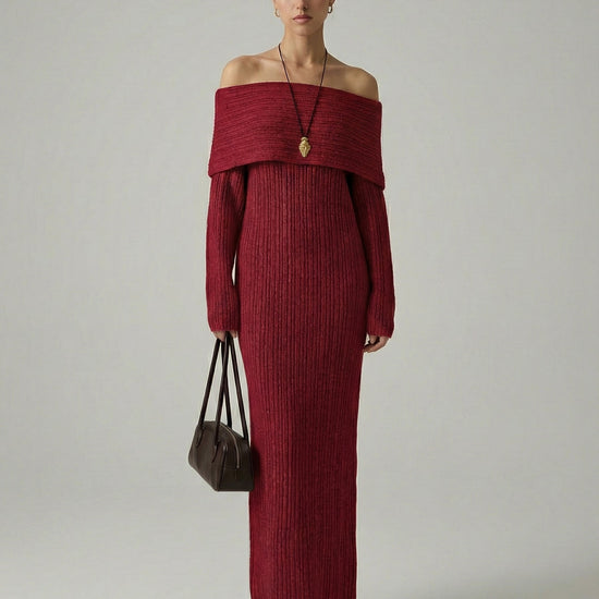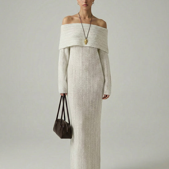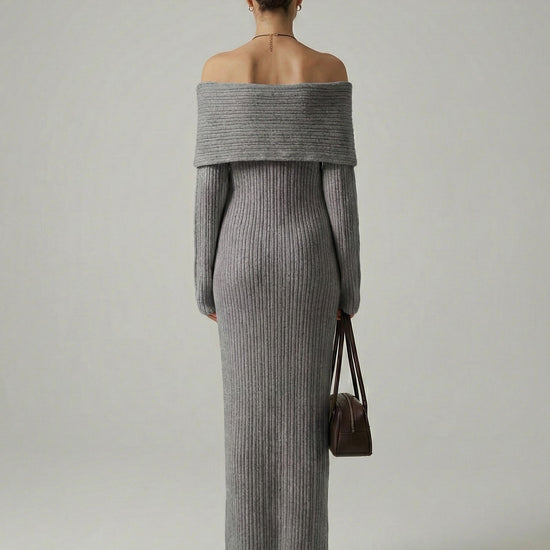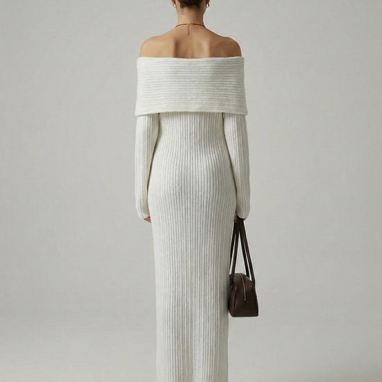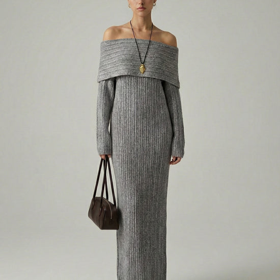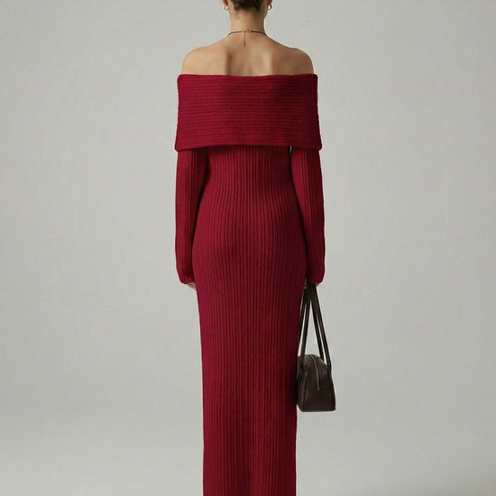 Exude effortless elegance in this sophisticated and cozy knit creation. This piece features a striking off-the-shoulder neckline with a wide fold-over cuff that beautifully frames the shoulders and décolletage. Crafted from a textured vertical ribbed material, the form-fitting silhouette provides a perfectly snatched look while flowing into a statuesque ankle-skimming finish. It is the ideal choice for refined seasonal gatherings or an elevated evening out.