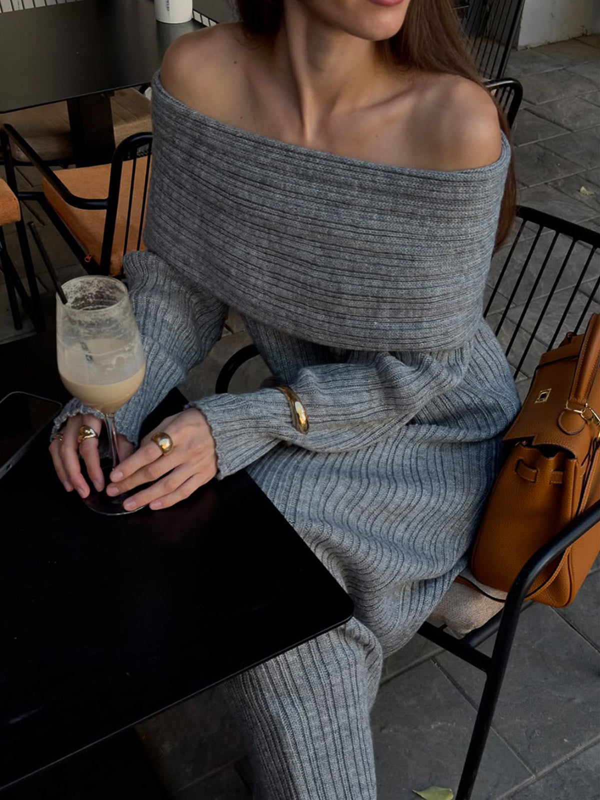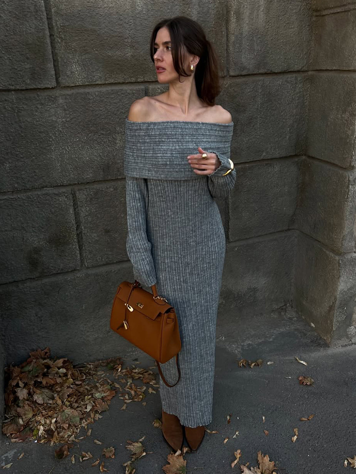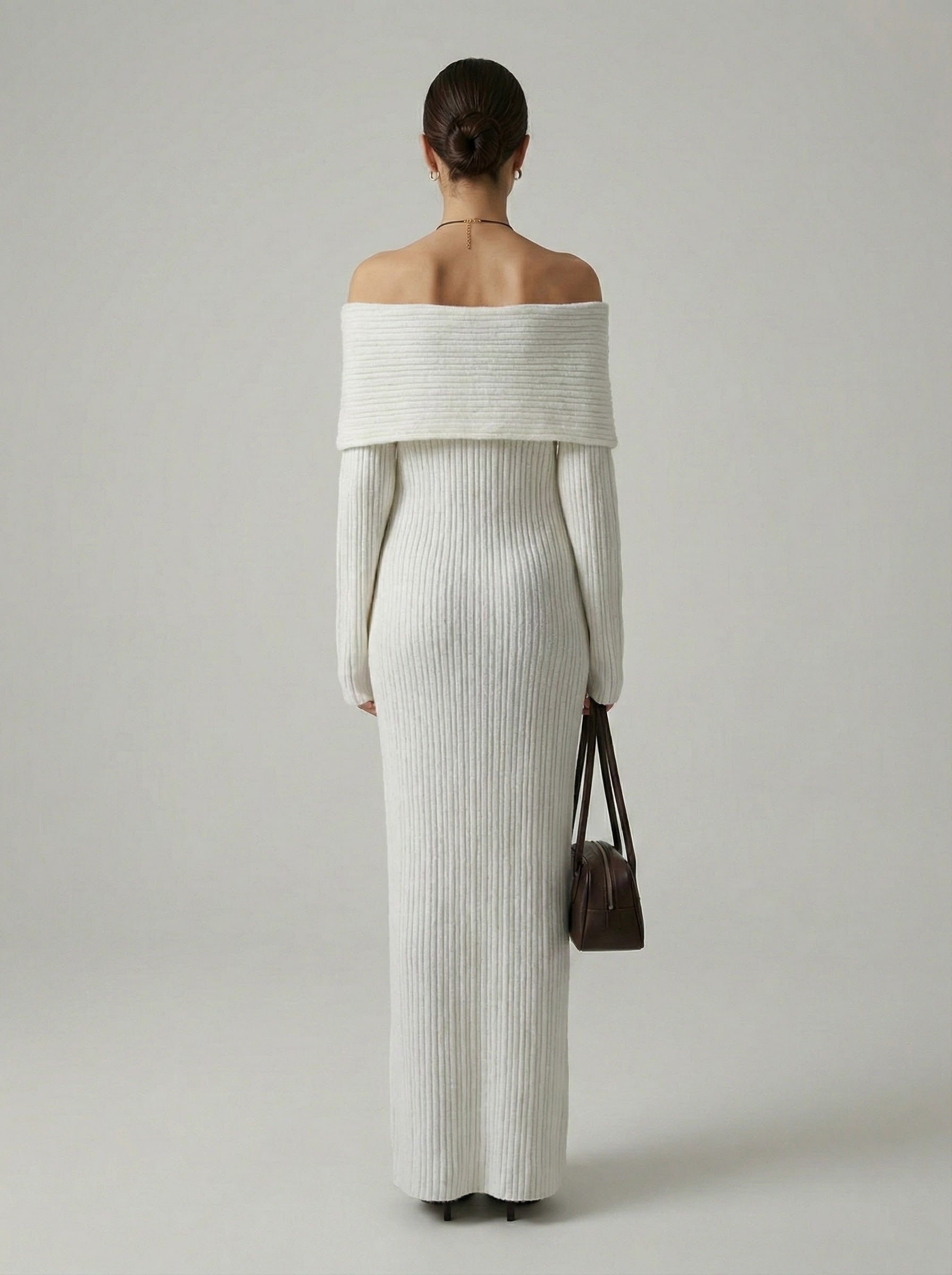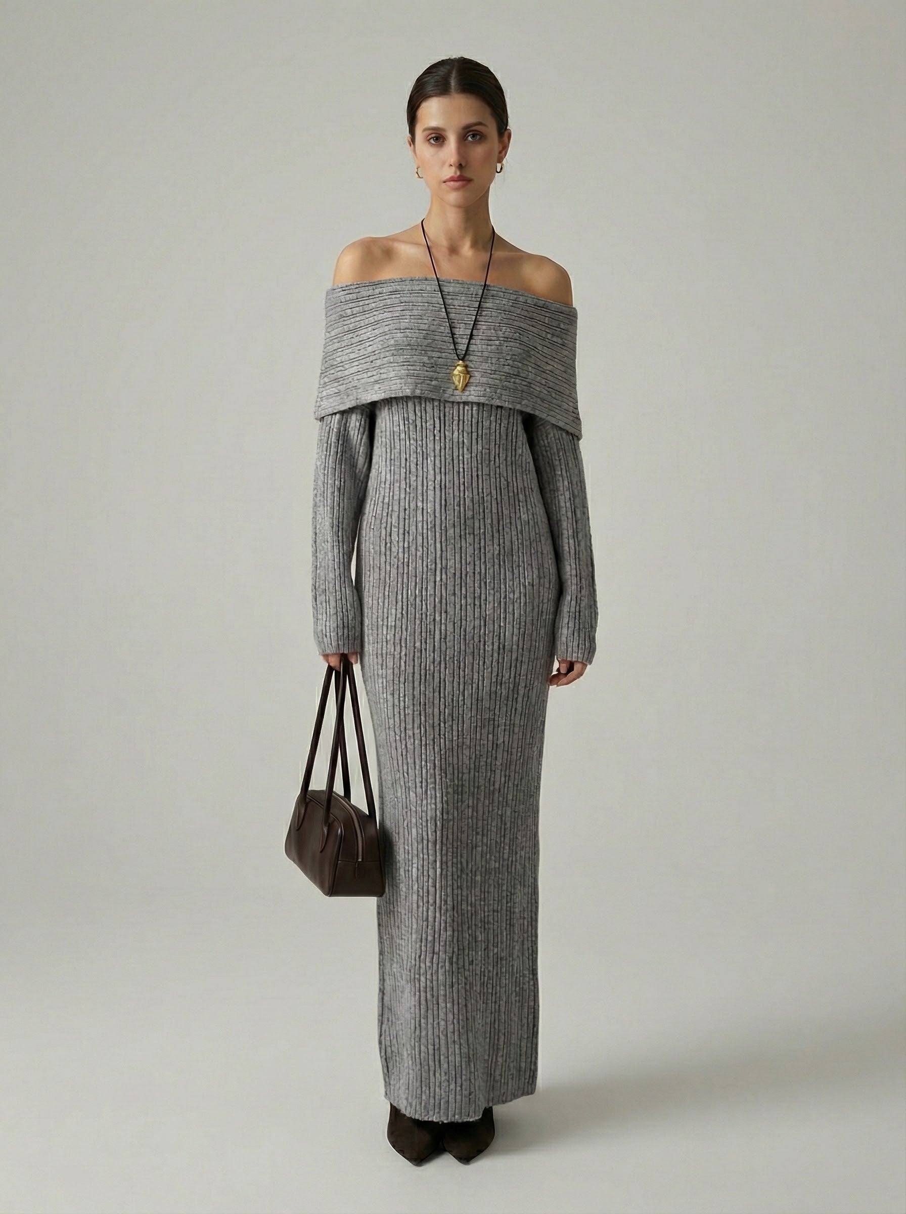 Exude effortless elegance in this sophisticated and cozy knit creation. This piece features a striking off-the-shoulder neckline with a wide fold-over cuff that beautifully frames the shoulders and décolletage. Crafted from a textured vertical ribbed material, the form-fitting silhouette provides a perfectly snatched look while flowing into a statuesque ankle-skimming finish. It is the ideal choice for refined seasonal gatherings or an elevated evening out.