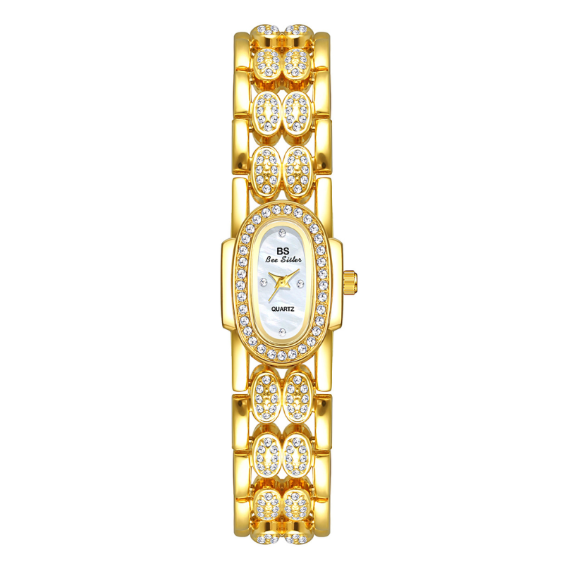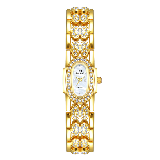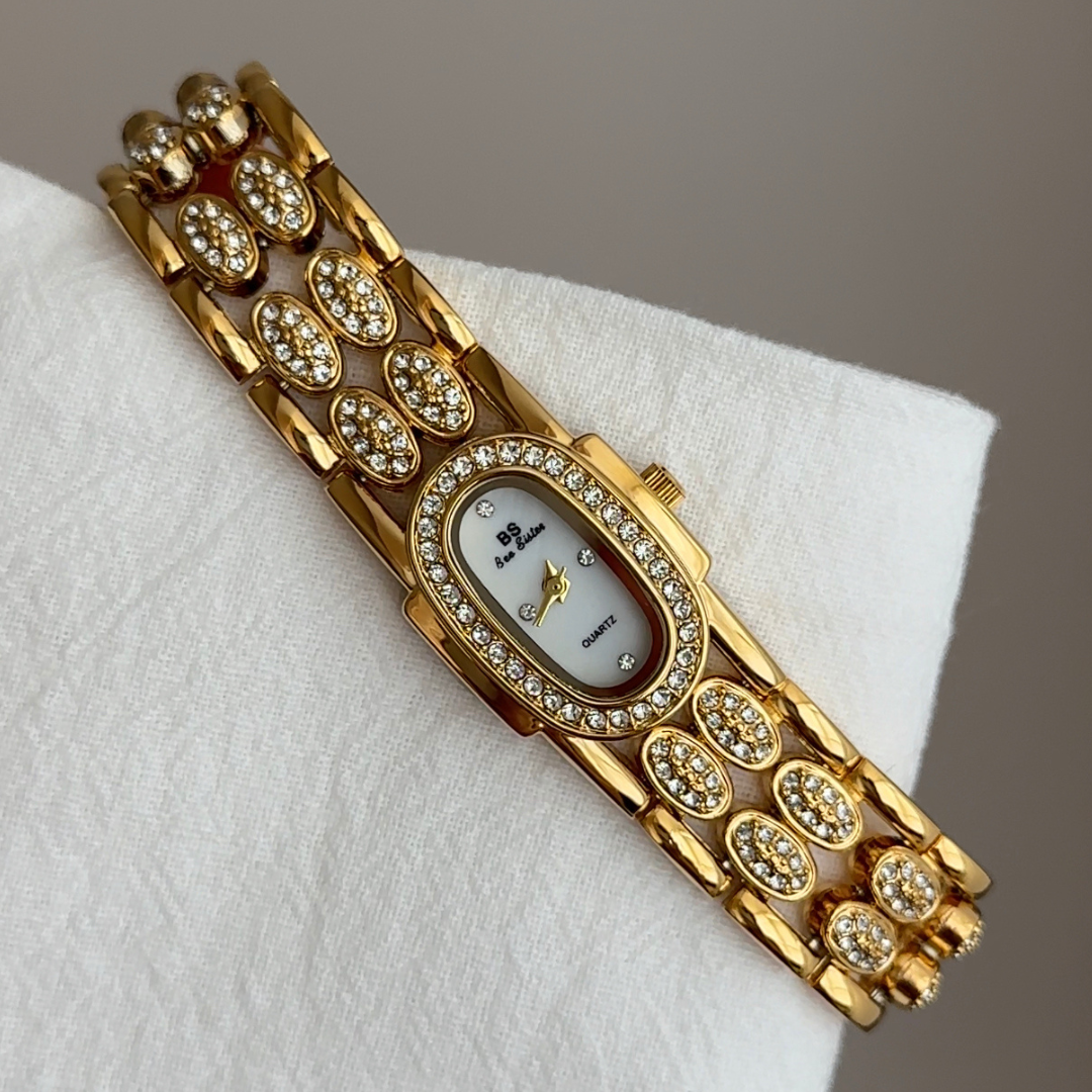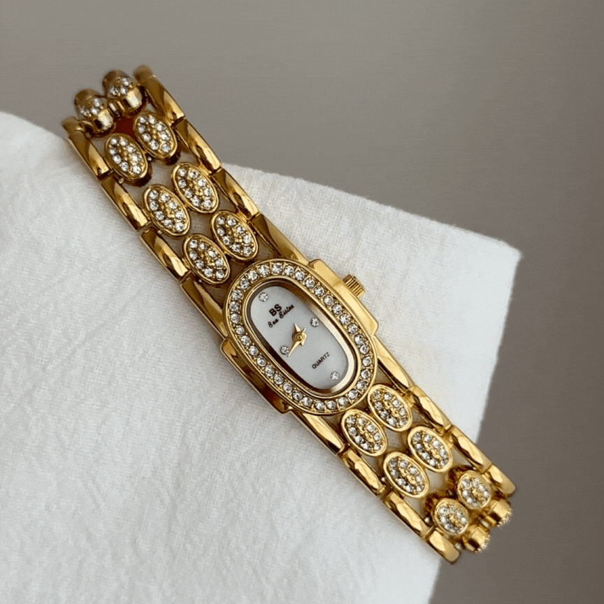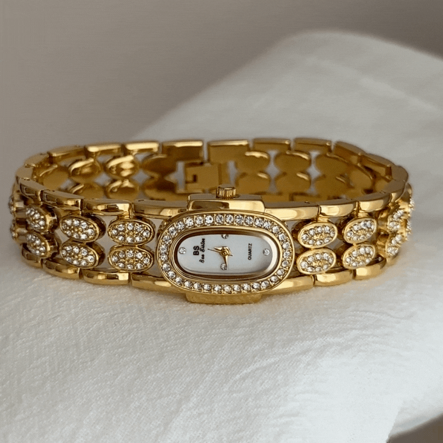 The Opaline Grace Quartz Watch embodies timeless elegance and vintage luxury. Featuring a polished gold bangle-style bracelet, an oval mother-of-pearl dial, and delicate crystal embellishments, this timepiece feels more like fine jewelry than a traditional watch. Its soft luster and refined curves make it the perfect statement piece for women who appreciate sophistication and feminine charm.