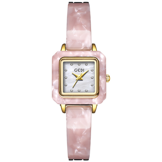Ovaj elegantni sat s jedinstvenim dizajnom narukvice inspirirane ružičastim jantarom ima nježno ružičasto kućište i bijeli četvrtasti brojčanik, spajajući sofisticiranost s modernom estetikom. Savršen je za elegantno, svakodnevno nošenje.