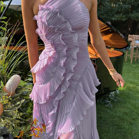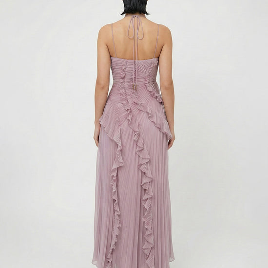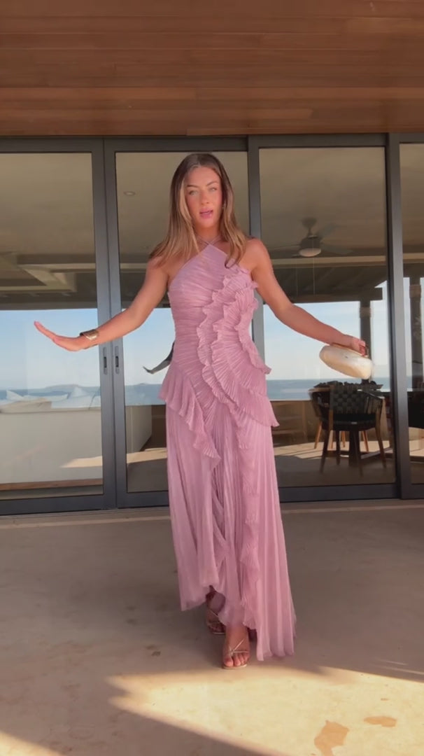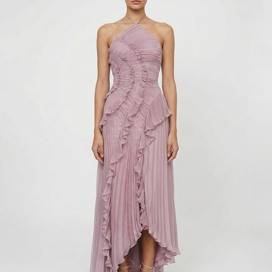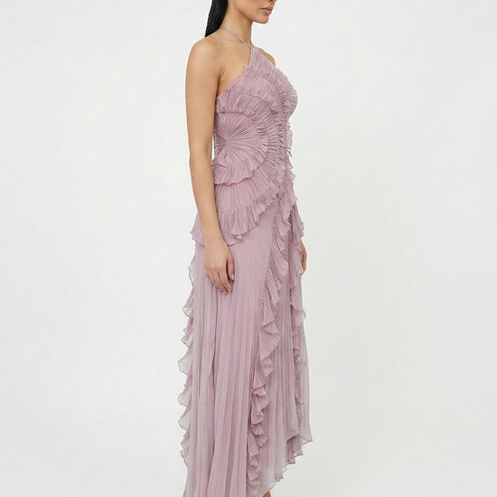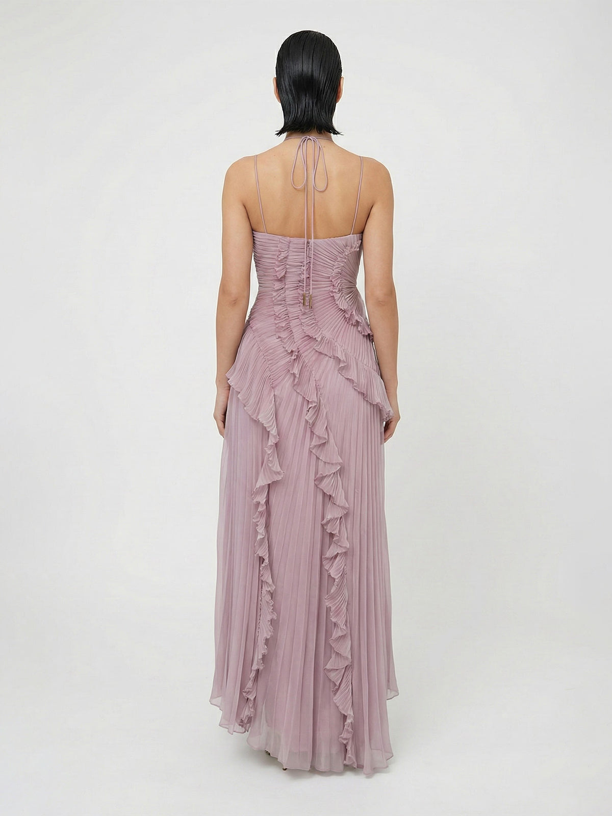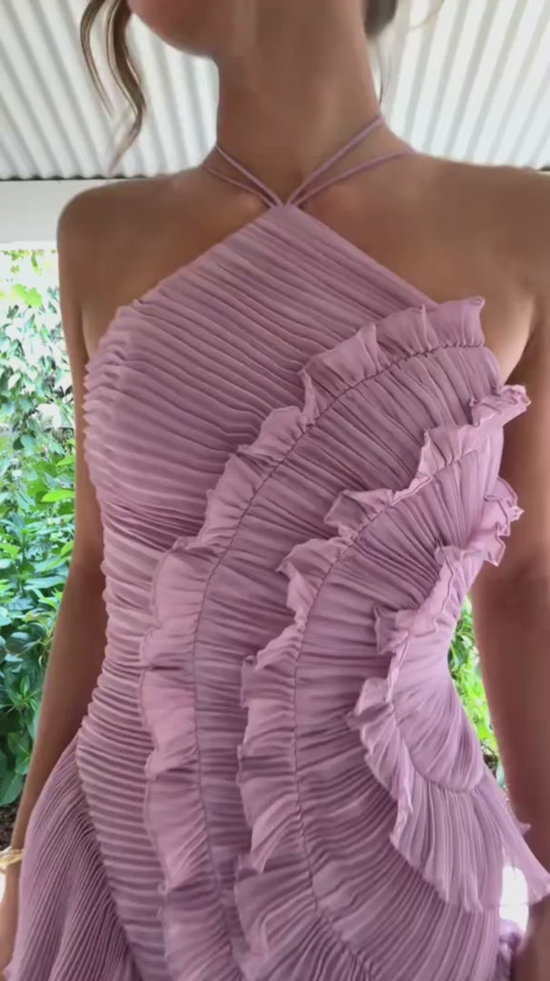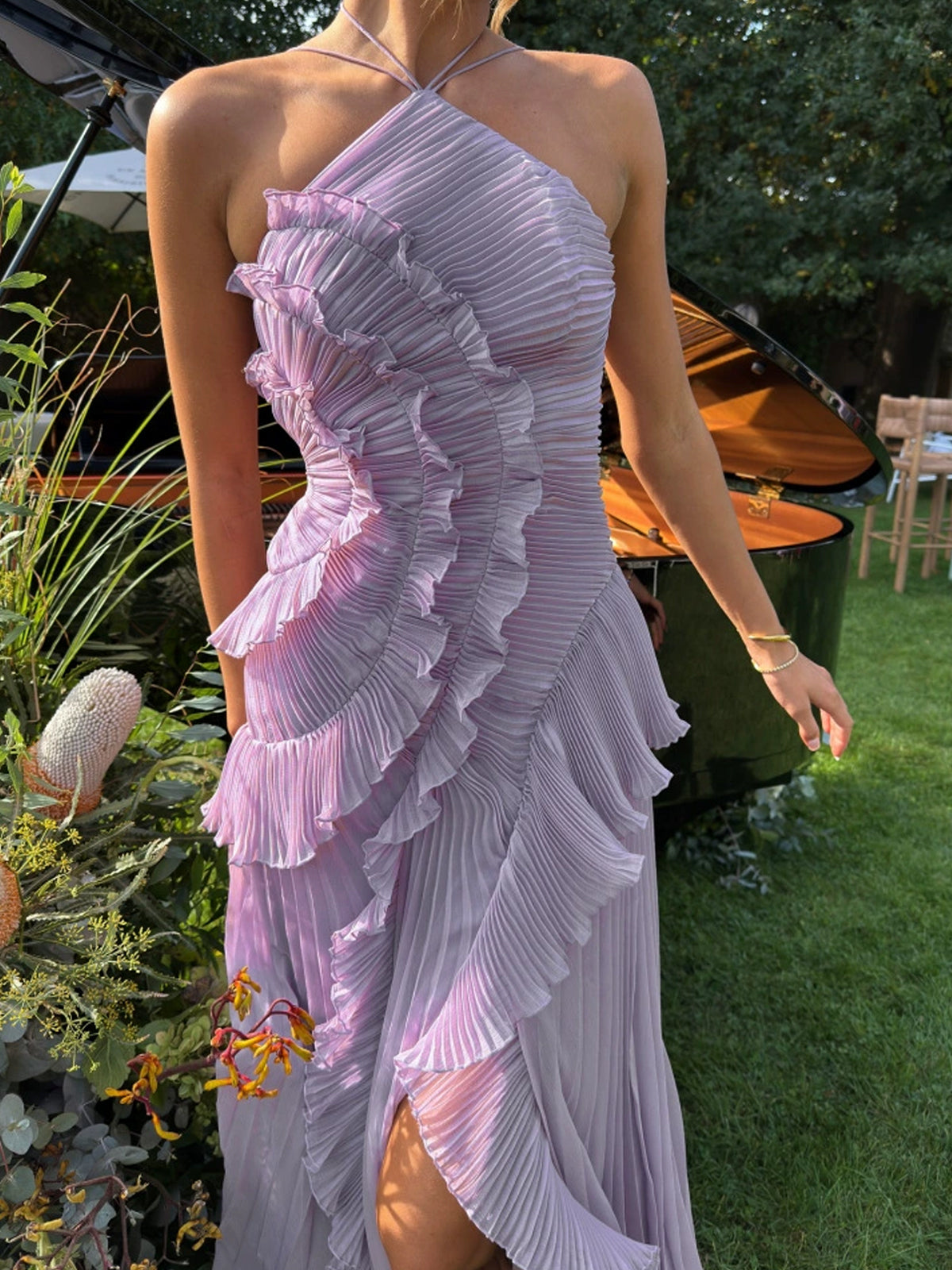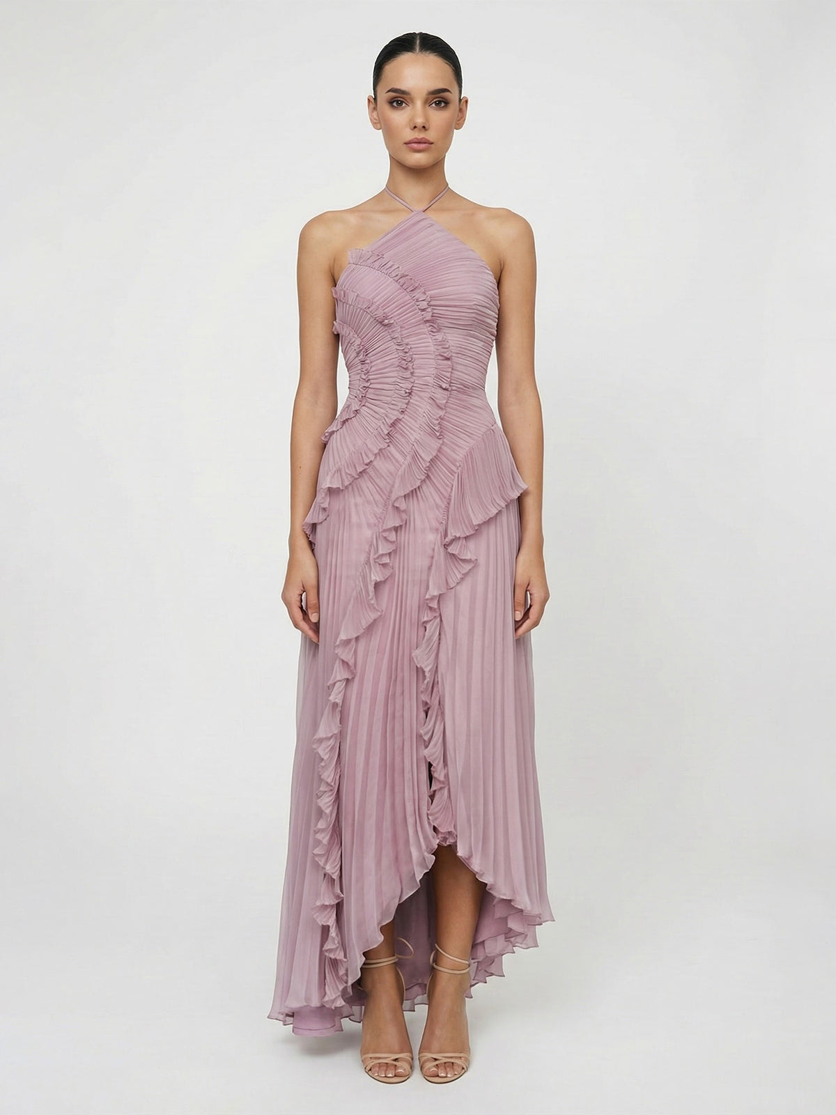 Make a graceful statement in this ethereal and expertly pleated creation. This piece features a sophisticated halter neckline and a daring open-back design with adjustable tie closures for a personalized fit. Cascading asymmetrical ruffles add dynamic volume and movement, while the continuous pleated texture creates a refined, high-fashion aesthetic. It is the perfect choice for garden weddings, summer galas, or upscale evening celebrations.