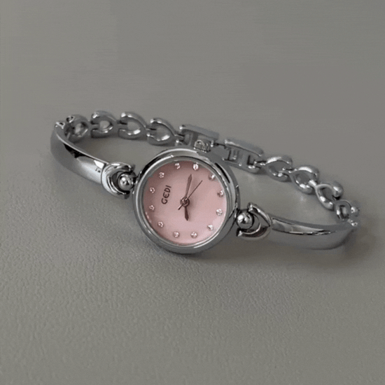 Ovaj elegantni ženski kvarcni sat ima srebrnu narukvicu u obliku narukvice uparenu sa šarmantnim okruglim ružičastim brojčanikom. Njegov minimalistički dizajn donosi profinjen, ženstven dodir, savršen za svakodnevno nošenje ili posebne prigode.