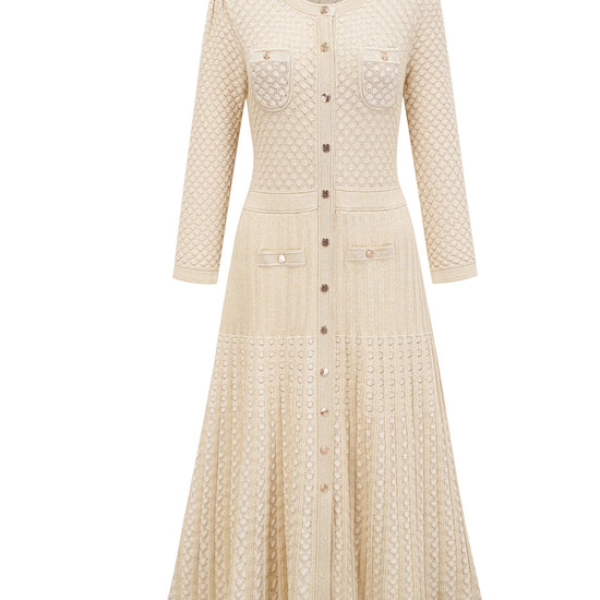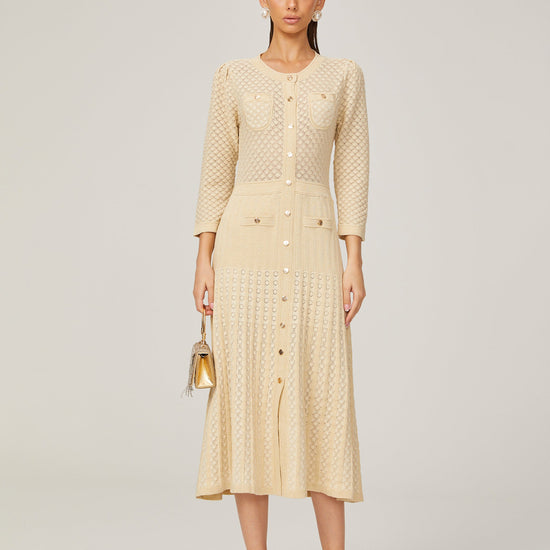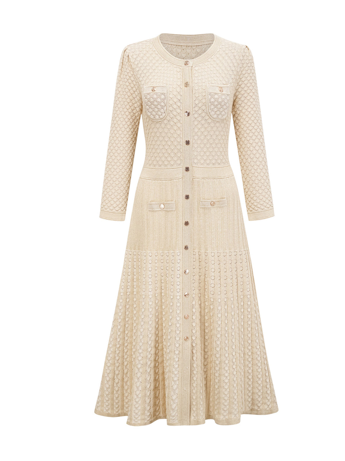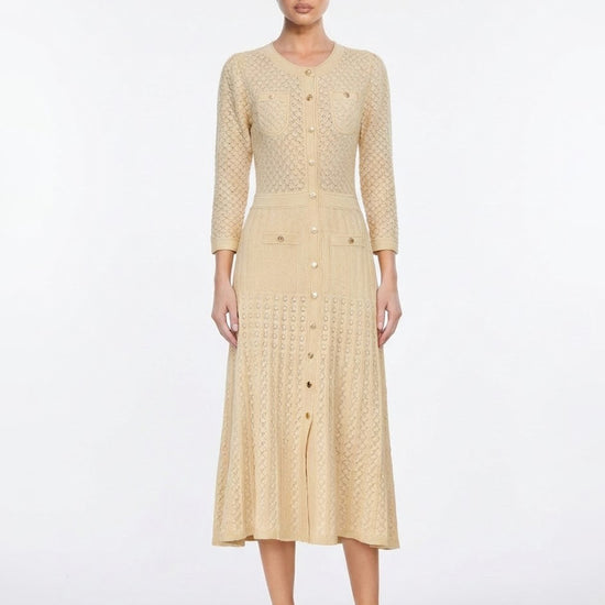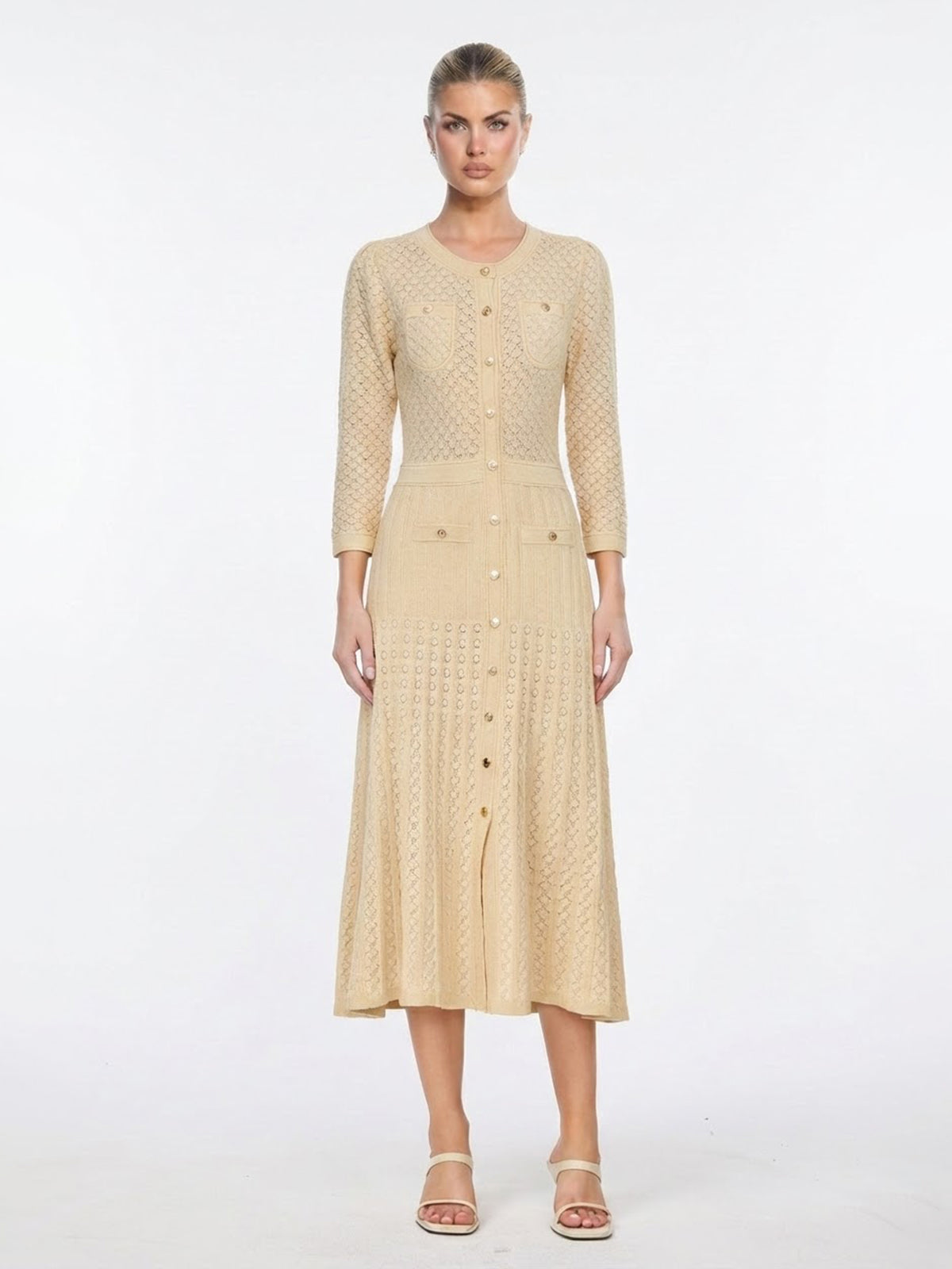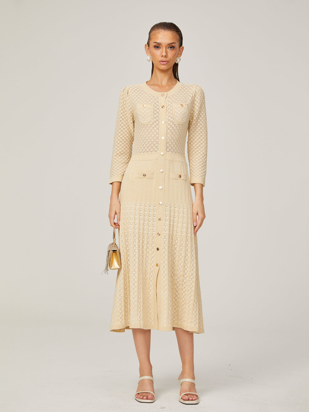 Elevate your daily look with this sophisticated textured knit creation. This piece features a classic round neckline and an elegant button-front closure accented with polished gold-tone hardware. Decorative faux pockets add a structured touch to the fitted bodice, while 3/4 sleeves and a flared midi-length hem create a timeless, feminine silhouette. Crafted from an intricate open-work knit, it offers a refined and premium feel for any occasion.