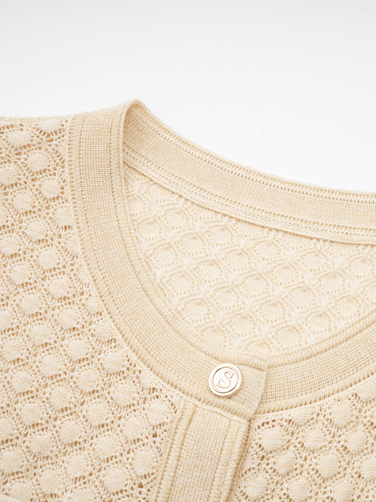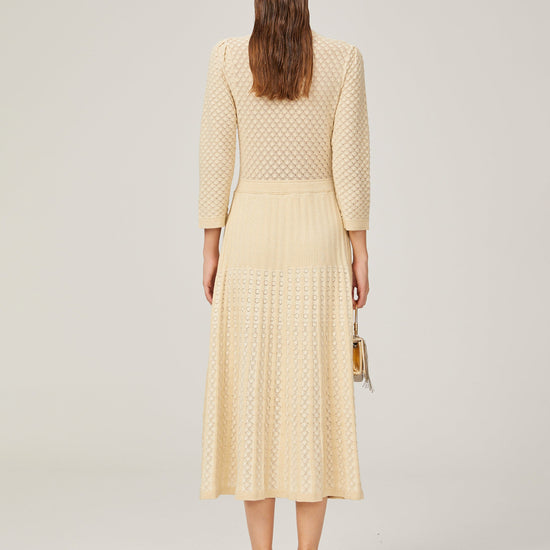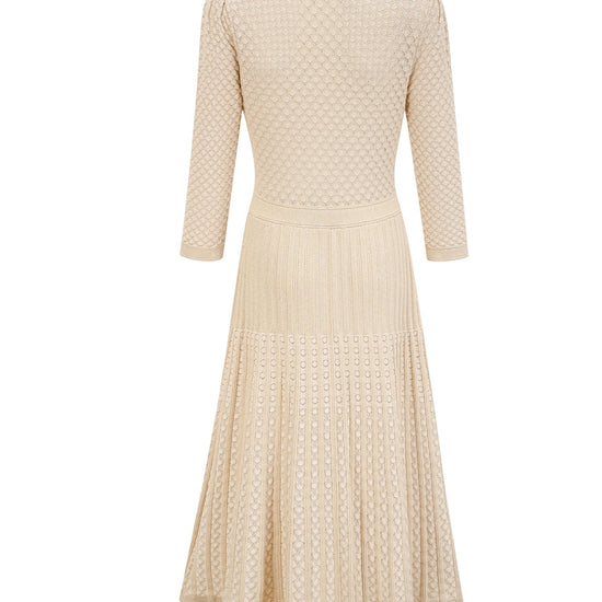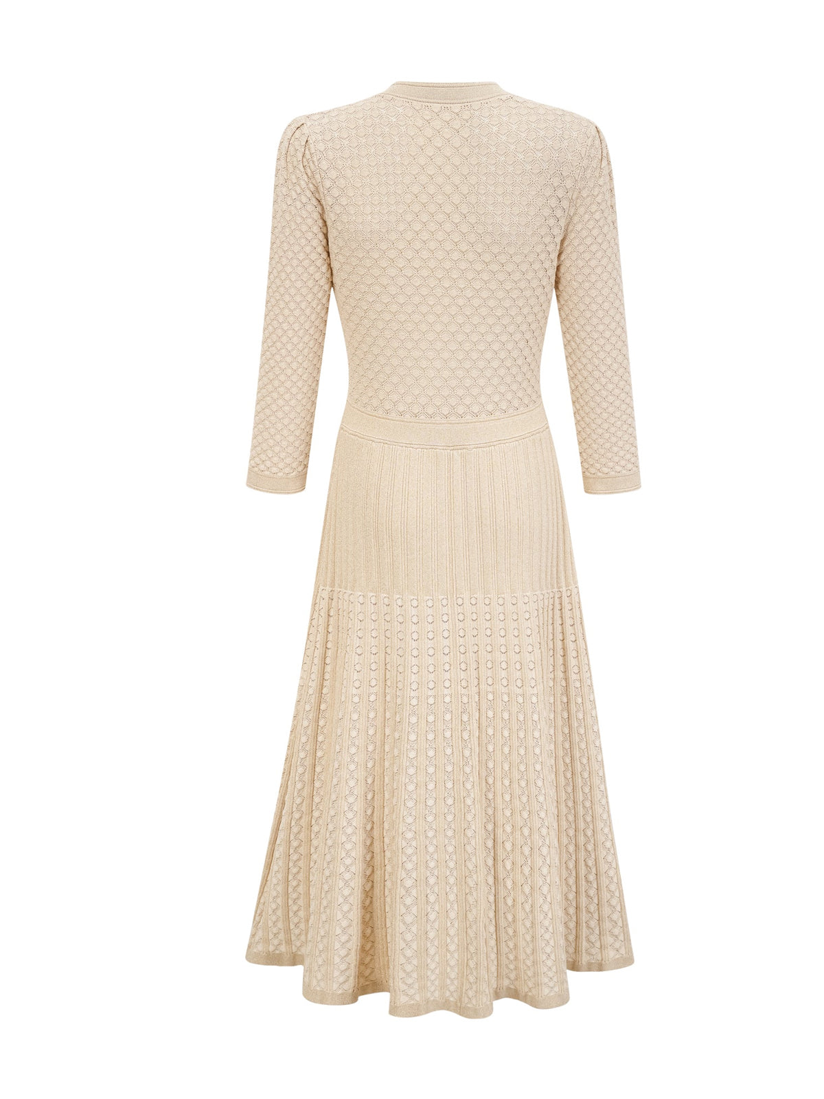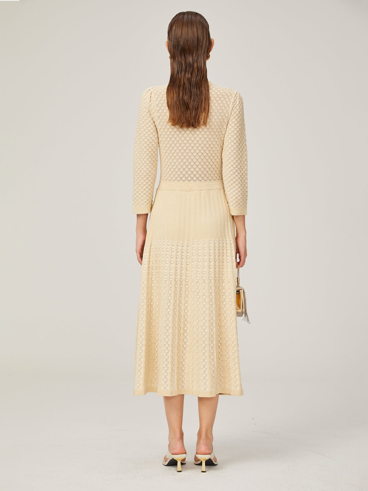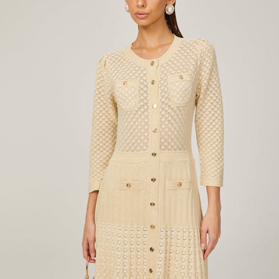 Elevate your daily look with this sophisticated textured knit creation. This piece features a classic round neckline and an elegant button-front closure accented with polished gold-tone hardware. Decorative faux pockets add a structured touch to the fitted bodice, while 3/4 sleeves and a flared midi-length hem create a timeless, feminine silhouette. Crafted from an intricate open-work knit, it offers a refined and premium feel for any occasion.