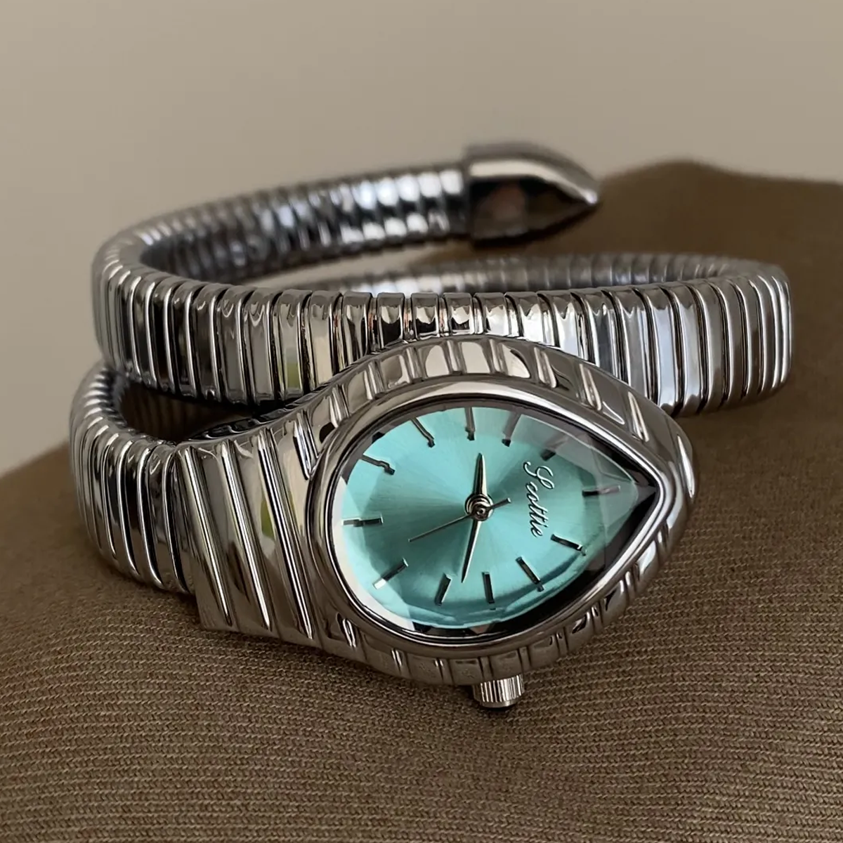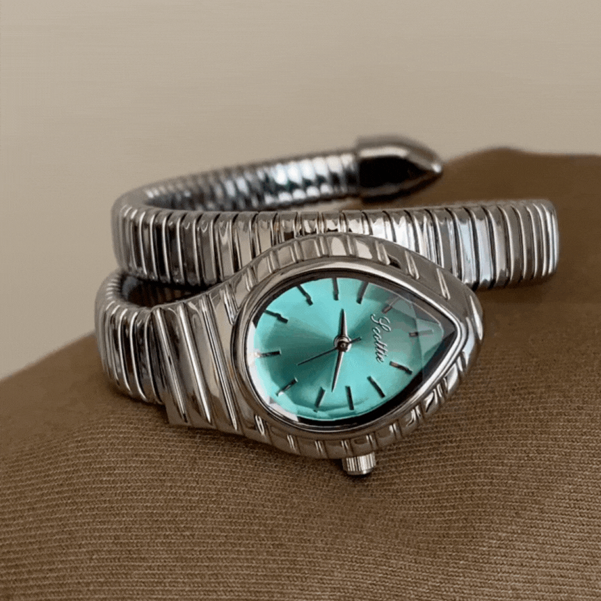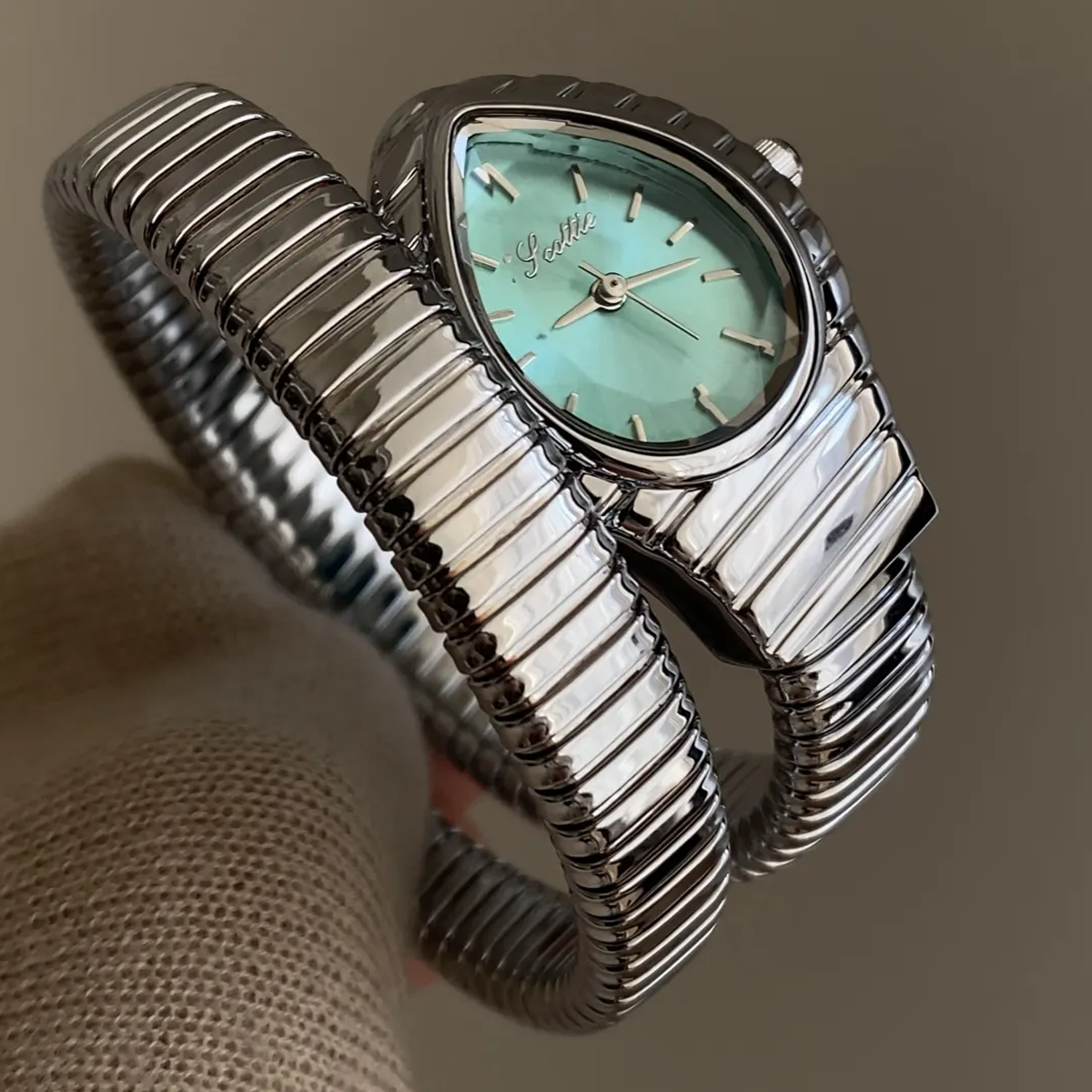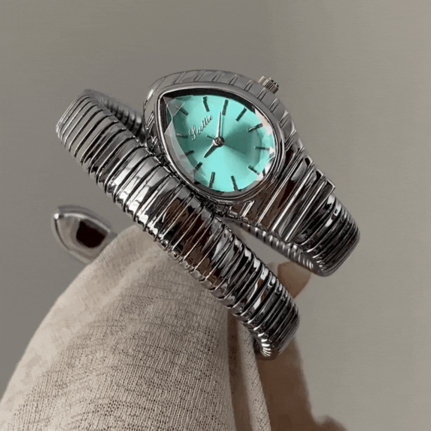 Ovaj elegantni kvarcni sat ima Tiffany plavi brojčanik u obliku zmijske glave, uparen s jedinstveni dizajn remena koji se obavija za odvažan, elegantan izgled. S precizni kvarcni mehanizam i privlačnim oblinama, to je upečatljiv modni dodatak koji spaja luksuz sa suvremenim stilom.