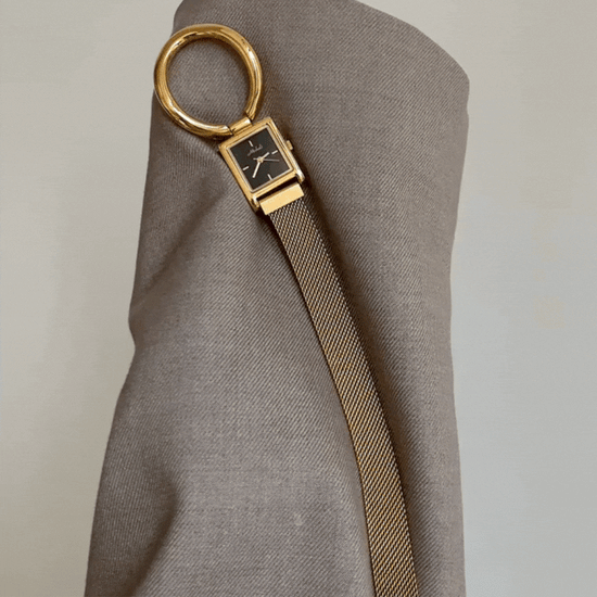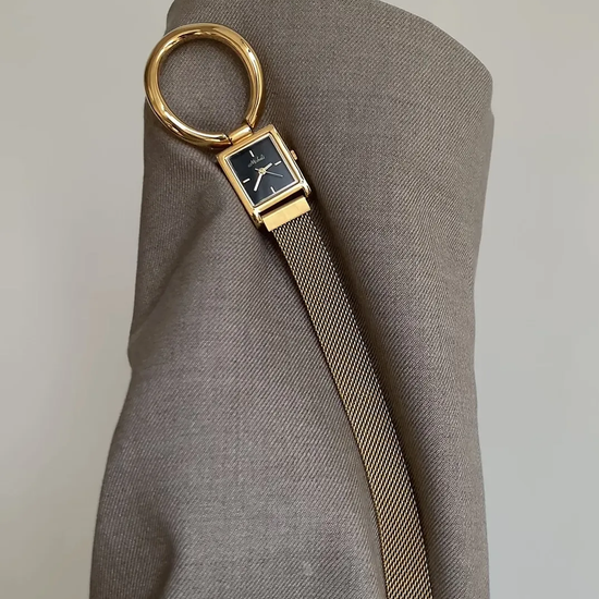 Ovaj suvremeni kvarcni sat ima elegantni crni pravokutni brojčanik uparen s remen s kružnim karikama zlatne boje i magnetska kopčaMinimalistički, a opet odvažan, dodaje dašak moderna elegancija i svakodnevna funkcionalnost uz bilo koju odjevnu kombinaciju.