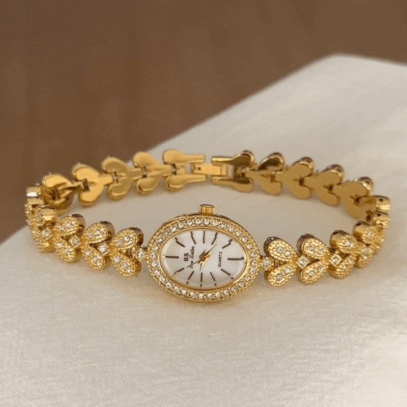 The Aurélia Grain blends timeless elegance with modern refinement. Crafted with a luxurious gold wheat-link bracelet, this women’s quartz watch features a delicate oval dial framed by sparkling crystal accents. The intricate texture of the bracelet mimics flowing golden wheat, exuding sophistication and femininity. Perfect for any occasion—from a business luncheon to an evening soirée.