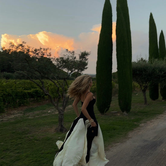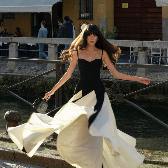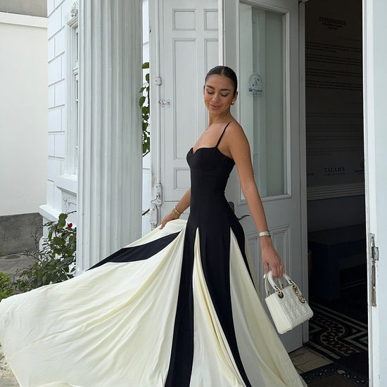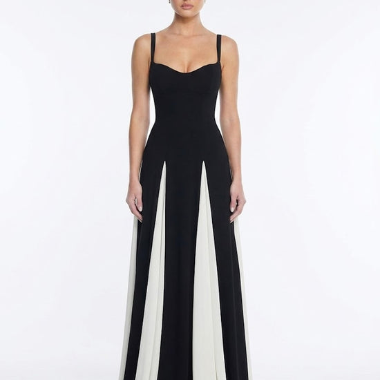 Exude timeless sophistication in this striking two-tone creation. This silhouette features a structured bodice with delicate spaghetti straps and a flattering curved neckline to frame the décolletage. The statuesque look flows into a voluminous skirt with contrasting pleated godet inserts that create dramatic movement and flair with every step. Finished with a clean back design, it offers a refined aesthetic for any high-profile event.
