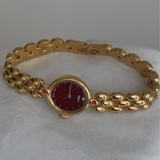 Ruby is a dainty women's watch featuring a small oval red dial and a slim gold bangle-style bracelet that blends fashion with timeless charm. Inspired by French elegance, it’s a statement of femininity and finesse.