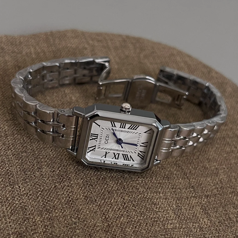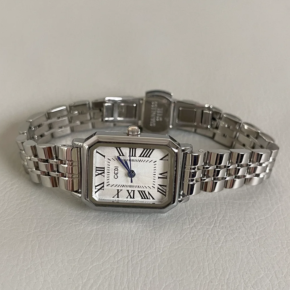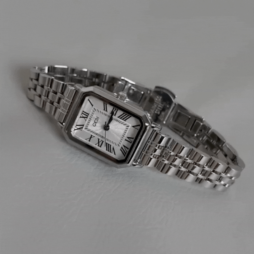 Ez a női kvarcóra a következő tulajdonságokkal rendelkezik: elegáns, téglalap alakú tok tiszta fehér számlap klasszikus hangsúlyozással Római számok. Párosítva egy polírozott ezüst színű szíj, a hagyományos dizájnt a modern minimalizmussal ötvözi – ideális a mindennapi kifinomultsághoz.