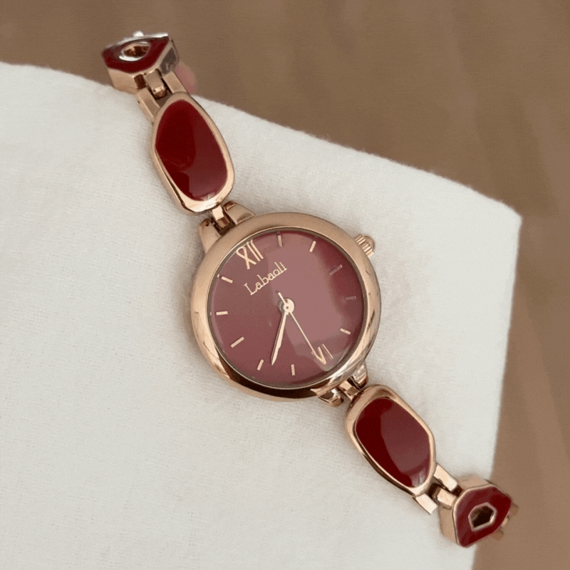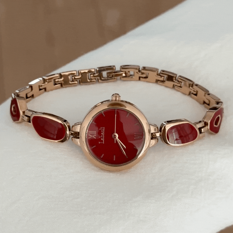 The Roselle Gem watch radiates refined elegance and feminine charm. Crafted in rose gold tones, it features a bracelet-style design delicately inlaid with gemstones, paired with a lustrous red dial that glows with confidence and sophistication. Perfectly balancing jewelry aesthetics and precise timekeeping, this watch is a timeless piece that elevates any outfit — from casual elegance to formal occasions.