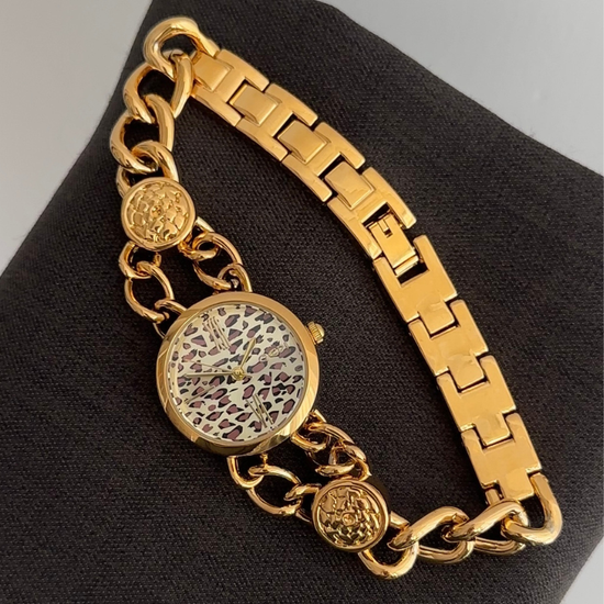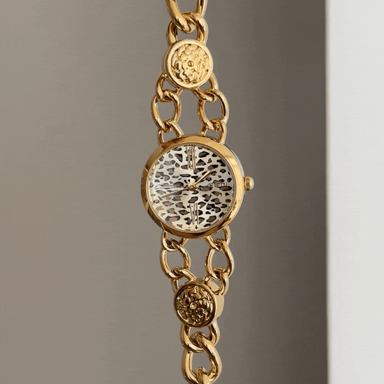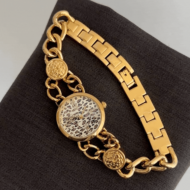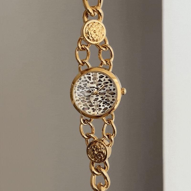 Embodying fearless vintage glamour, this watch features a brown leopard print dial framed by a polished gold bezel and a flexible cuff-style bracelet. Powered by reliable quartz, it is durable and comfortable for daily wear. Versatile from day to evening, it’s an ideal gift or personal emblem of bold, retro luxury.