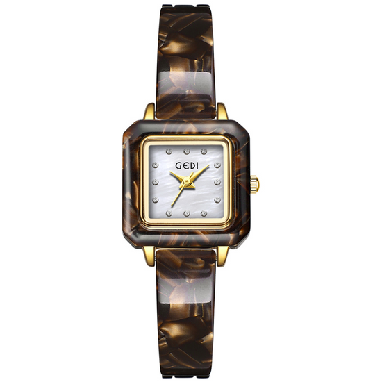 Questo elegante orologio presenta un esclusivo design a bracciale ispirato all'ambra marrone, abbinato a una cassa marrone coordinata e a un nitido quadrante quadrato bianco. Un perfetto connubio tra fascino vintage e raffinatezza moderna.