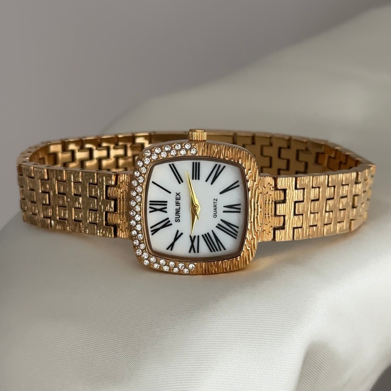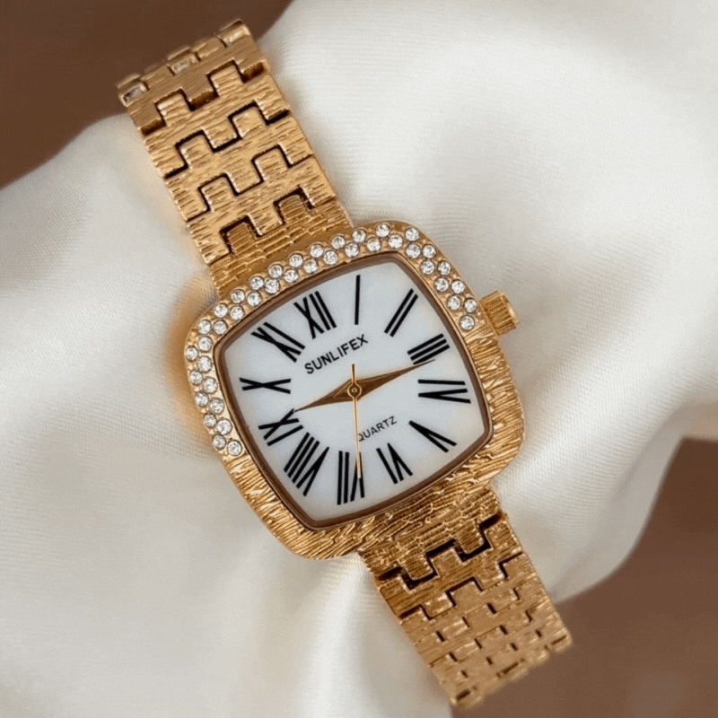 Combining sophistication with everyday versatility, this watch features a pristine white rectangular dial framed by a gold-tone bezel sparkling with simulated diamonds. The matching gold alloy bracelet is crafted for durability and refined style.