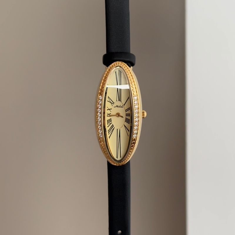 Merging architectural geometry with refined brilliance for bold yet versatile elegance. Features an elongated gold oval sunburst dial framed by a polished gold-tone bezel set with cubic zirconia stones, paired with a classic black genuine leather strap for sophisticated contrast. Reliable quartz movement ensures precise timekeeping. Adjustable, scratch-resistant, and water-resistant, it transitions effortlessly from day to evening—serving as both a functional accessory and a confident style statement, ideal as a distinguished milestone gift or personal indulgence harmonizing contemporary design with timeless craftsmanship.