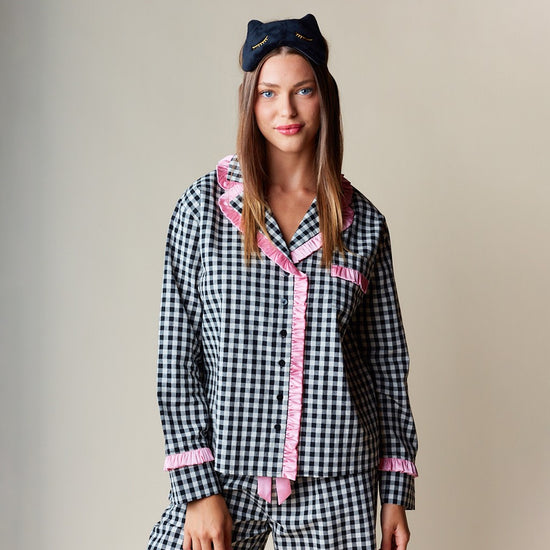 Stay cozy and stylish with this classic pattern elevated by playful, vibrant accents. The long-sleeve top features a sophisticated notched collar with delicate ruffle trim that continues down the front closure and cuffs for a feminine touch. Matching high-waisted bottoms offer a relaxed, wide-leg silhouette and a comfortable fit with an adjustable ribbon drawstring at the waist. Complete with a coordinated eye mask featuring adorable ear details, this look is perfect for slow weekend mornings or a cozy night in.