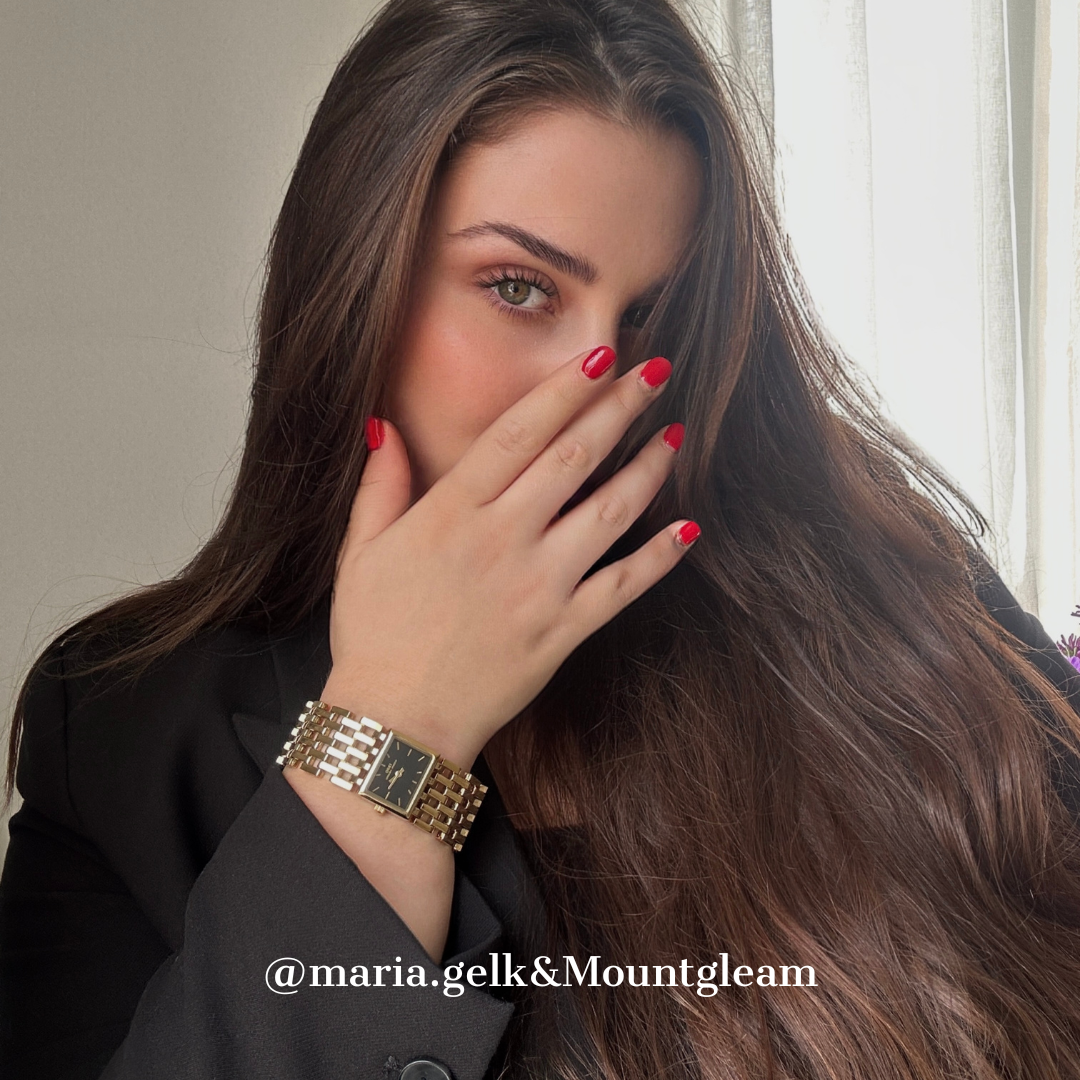 A timeless women’s quartz watch with a bold wide gold strap, square case, and classic black dial. Designed in sophisticated old money style, this elegant timepiece adds effortless refinement to both everyday and formal looks.