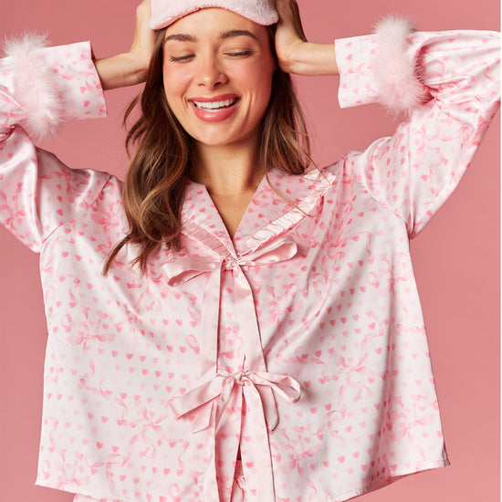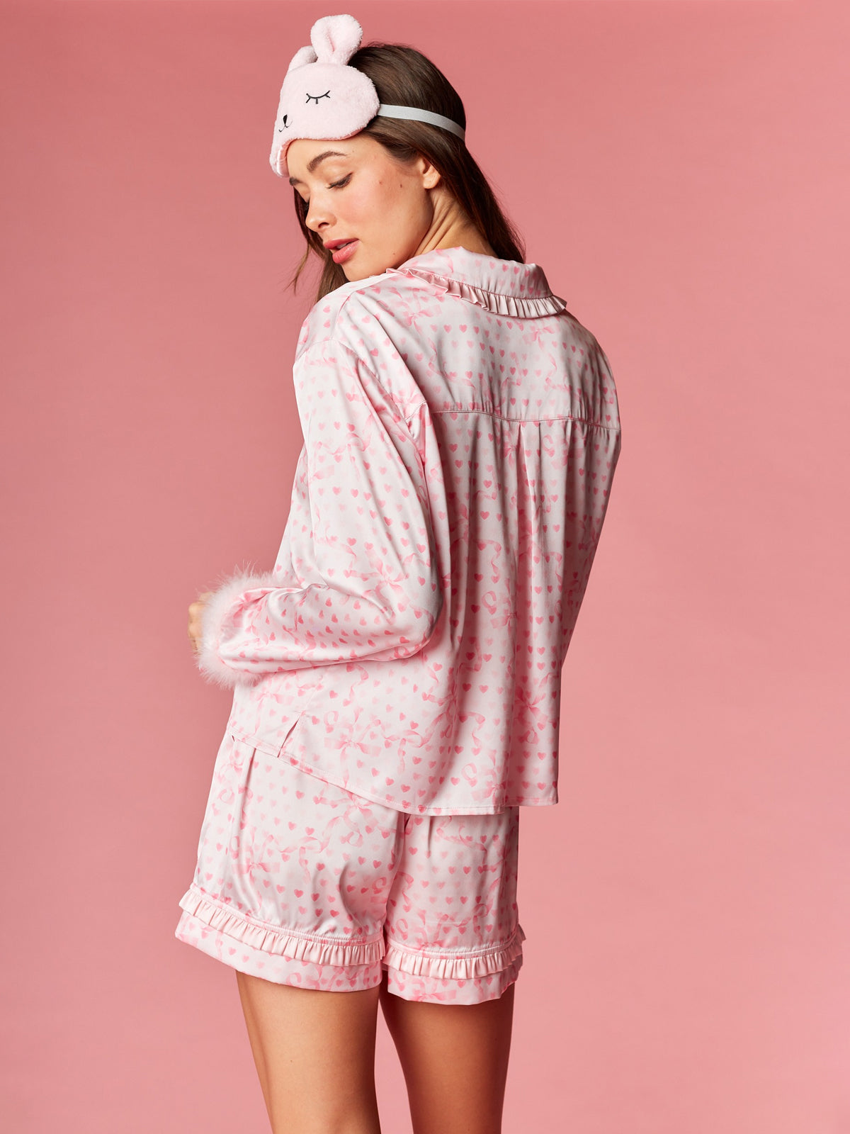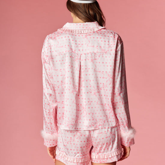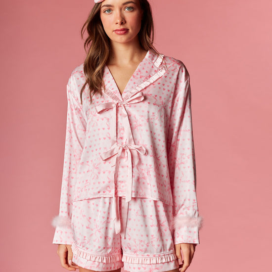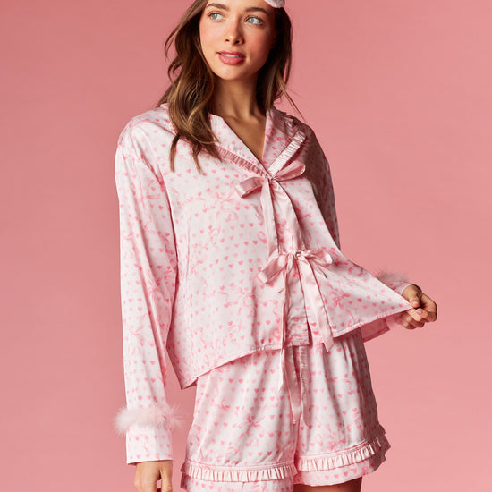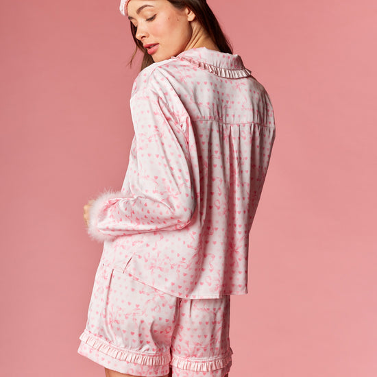 Fall in love with your nighttime routine in this sweet and playful ensemble. This collection features a charming heart and ribbon motif throughout, designed to add a romantic touch to your evening. The top is detailed with a dainty ruffled collar and feminine front ribbon ties, while the sleeves are finished with plush faux-fur cuffs for a hint of luxury. Paired with matching shorts that feature a flirty ruffled hem, these pieces are completed by a coordinated sleep mask for the ultimate dreamy aesthetic.
