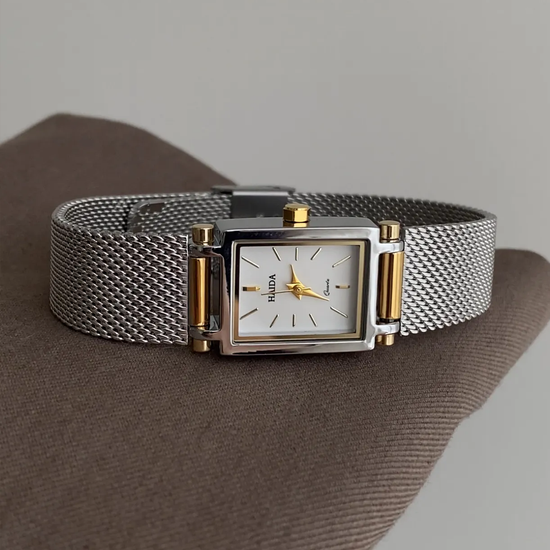 Questo orologio al quarzo da donna dà vita al minimalismo moderno con un quadrante bianco rettangolare sottile, ambientato in un raffinata cassa bicolore (argento e oro), e completato con un cinturino in maglia di grano color argento lucidoLa geometria pulita e il morbido contrasto metallico offrono un'eleganza raffinata e quotidiana.