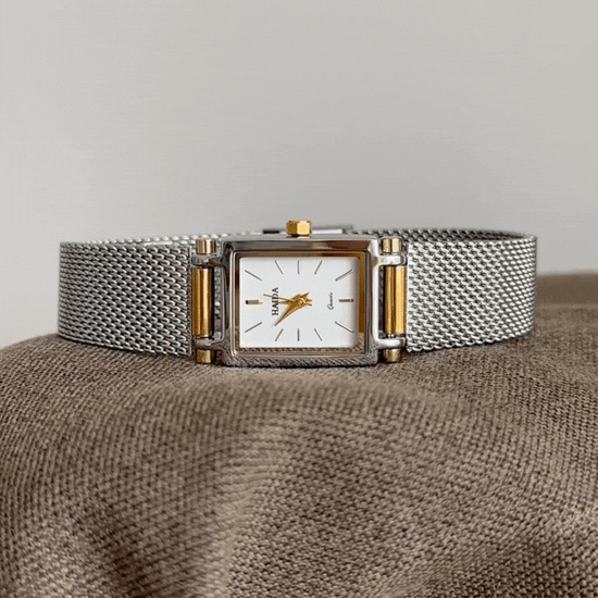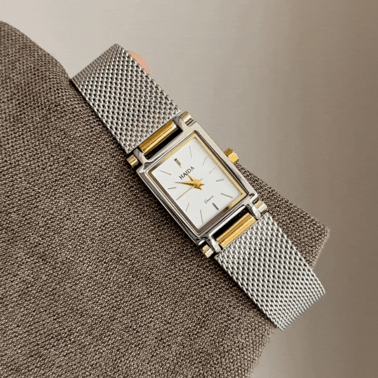 Linea-orologio rettangolare bicolore rettangolare con banda in mesh d'argento