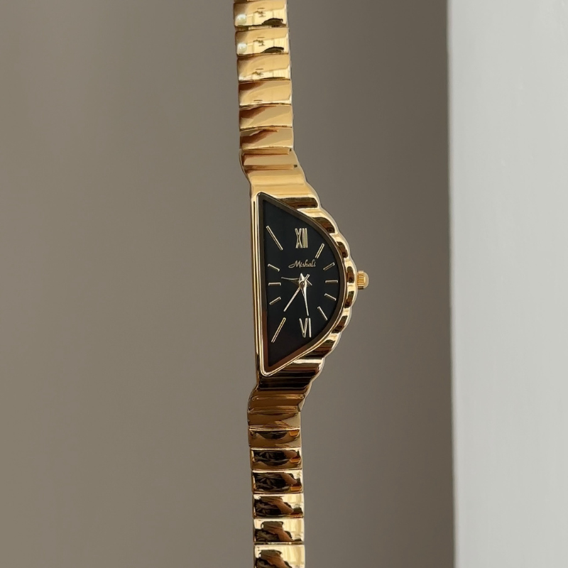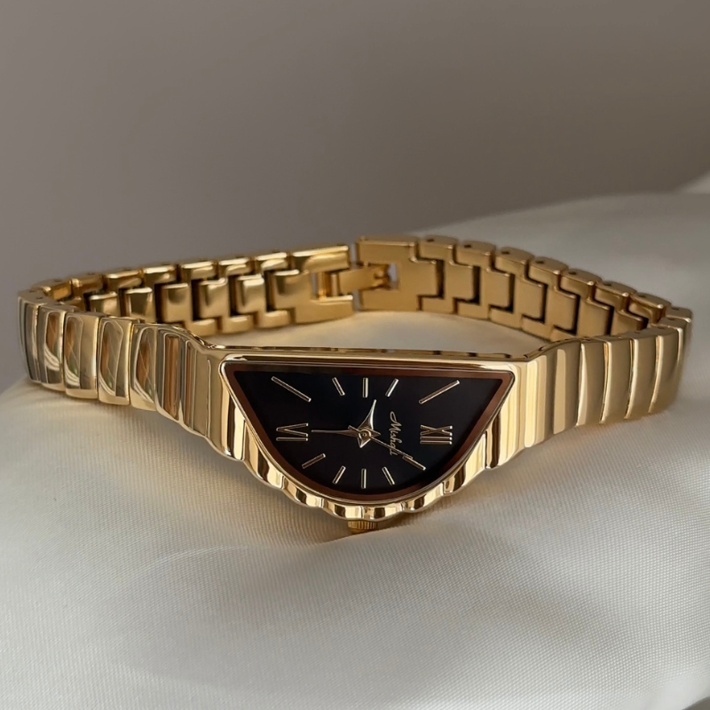 This visionary timepiece redefines modern watchmaking with its bold black irregular crescent dial set in a polished gold bezel for striking contrast. The complementary gold stainless steel bracelet ensures durability while maintaining the avant-garde aesthetic. Precision quartz movement delivers accurate timekeeping within this sculptural design that breaks from tradition.
