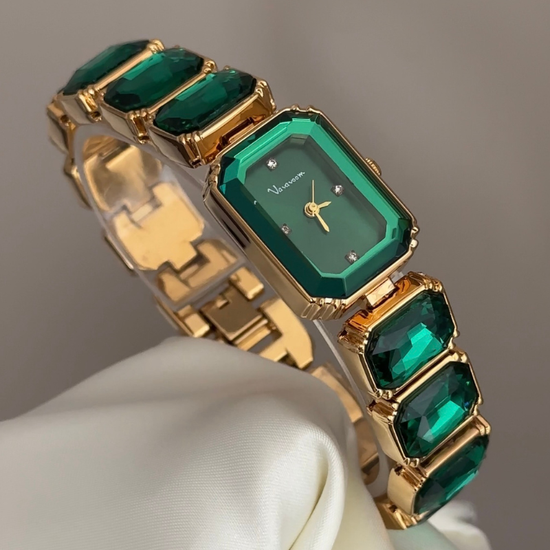 Modern Chic: Green Rectangle Dial with Gold Bezel & Green Gemstone Inlaid Bracelet