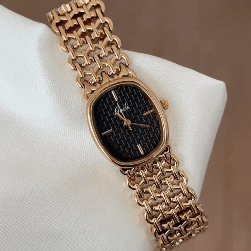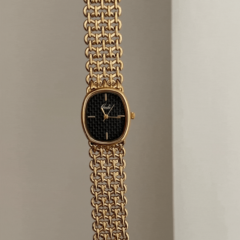 Unveil a new standard of refined style with our Luxury Oval Watch. This remarkable creation presents a captivating black dial nestled in an exquisitely shaped gold oval case, accompanied by a superior gold-hued alloy bracelet. The seamless fusion of tonal elegance and luxury craftsmanship yields an exceptionally versatile piece that enhances any look with quiet sophistication.