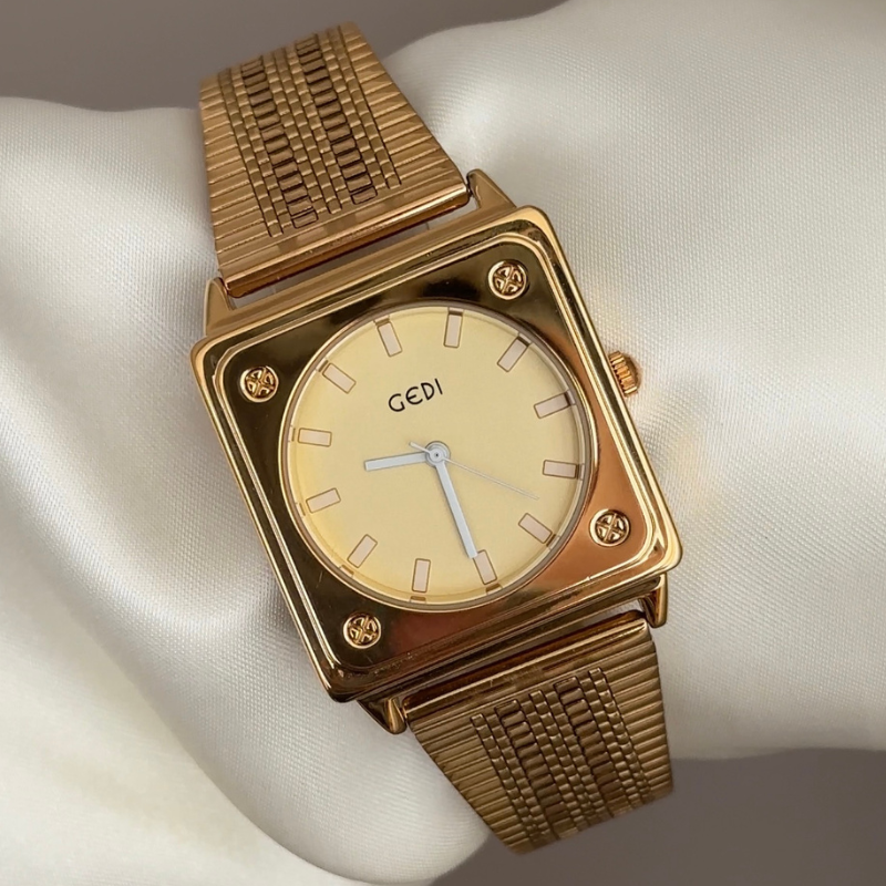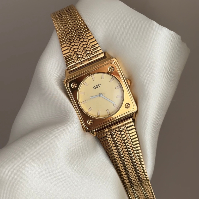 Defining contemporary elegance through clean geometry and a versatile monochromatic palette. Features a bold gold square sunburst dial framed by a polished gold-tone case, paired with a matching gold stainless steel bracelet. Reliable quartz movement ensures accurate timekeeping. Adjustable, scratch-resistant, and water-resistant, it transitions effortlessly from office to evening—serving as both a functional tool and a polished style statement, ideal as a career milestone gift or personal upgrade balancing modern design with timeless metallic sophistication.