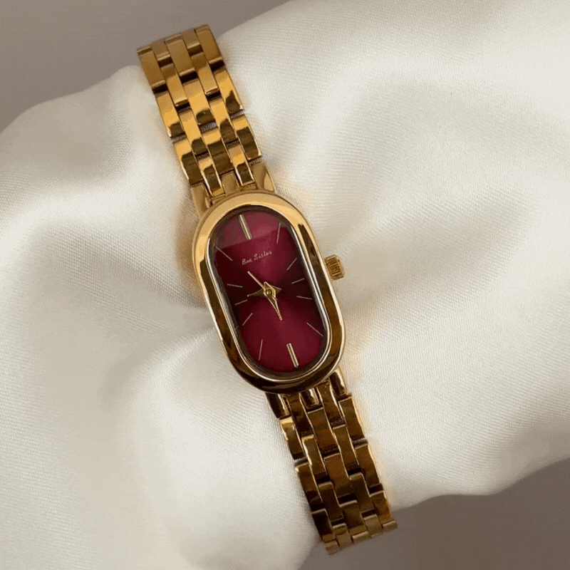 Modern Vintage Red Long Oval Dial Watch – Gold Stainless Steel Quartz Bracelet