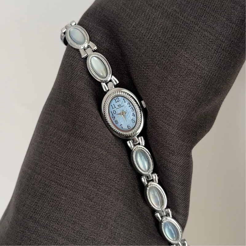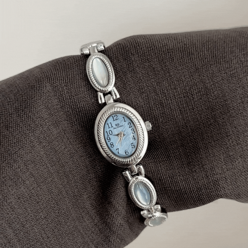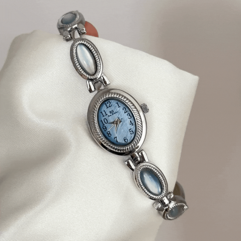 Oceanic Elegance: Blue Oval Dial with Silver Bezel & Abalone Sapphire Bracelet