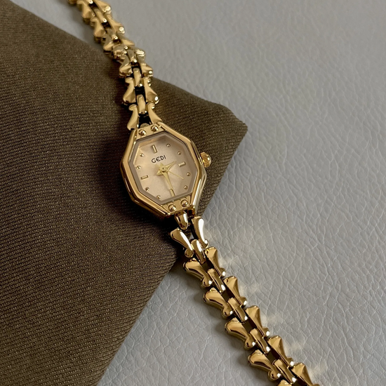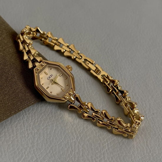 Questo sorprendente orologio al quarzo è dotato di un bracciale unico con design a spina d'oro e un elegante quadrante ottagonale in oro, che unisce l'eleganza a un tocco audace e moderno. Con movimento al quarzo preciso e con un design accattivante, è il pezzo perfetto per ogni occasione.