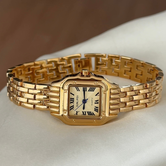 Embrace geometric luxury with our gold rectangular watch, where sharp angles meet radiant elegance. This sophisticated timepiece features a striking rectangular gold dial framed by a matching gold-toned bezel, flowing seamlessly into a polished alloy bracelet. The cohesive monochromatic design creates a powerful style statement through its clean lines and uniform brilliance.