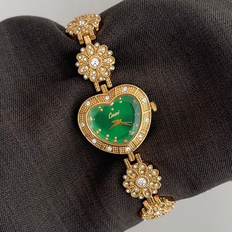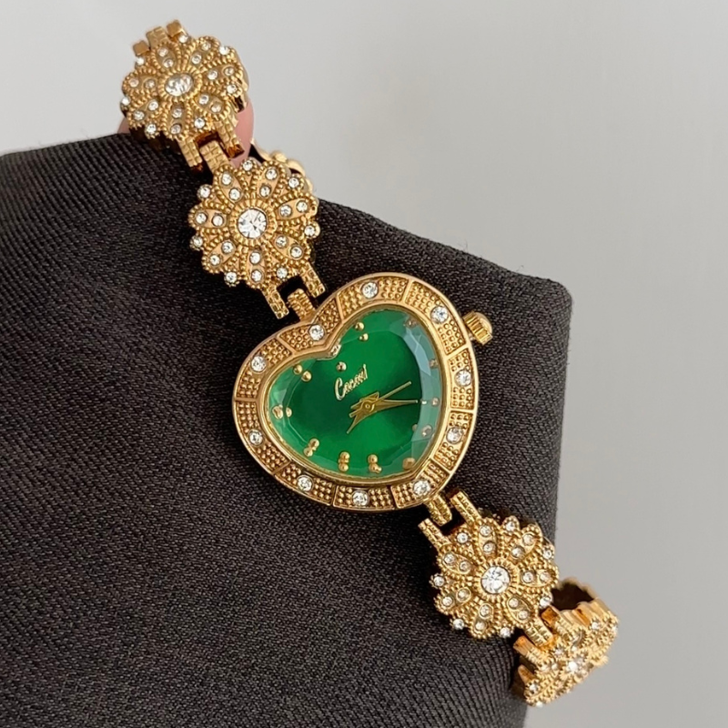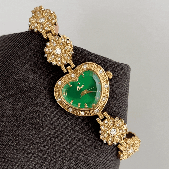 This unique watch showcases a vibrant green heart-shaped dial, matching gold heart bezel, and a delicate floral-patterned stainless steel bracelet. Blending artistic charm with all-day comfort and precise quartz movement, it transitions seamlessly from playful daytime romance to a captivating statement piece for special occasions—a true wearable work of art.