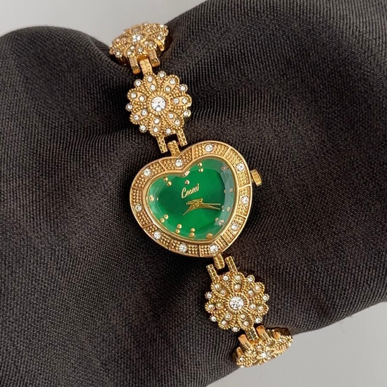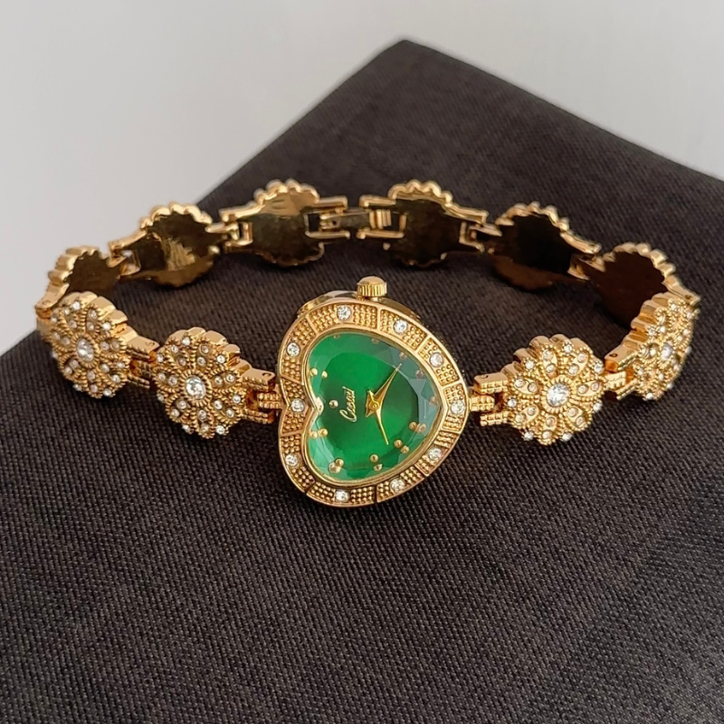 Romantic Whimsy: Green Heart-Shaped Dial with Floral Gold-Tone Bracelet