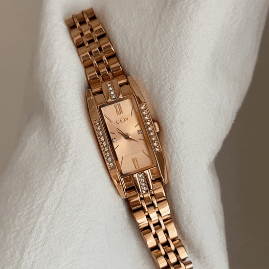 A refined women’s quartz watch featuring a rose gold rectangular dial and a crystal-studded case. With its French-inspired elegance and timeless silhouette, it’s the perfect accessory for both daily sophistication and special occasions.