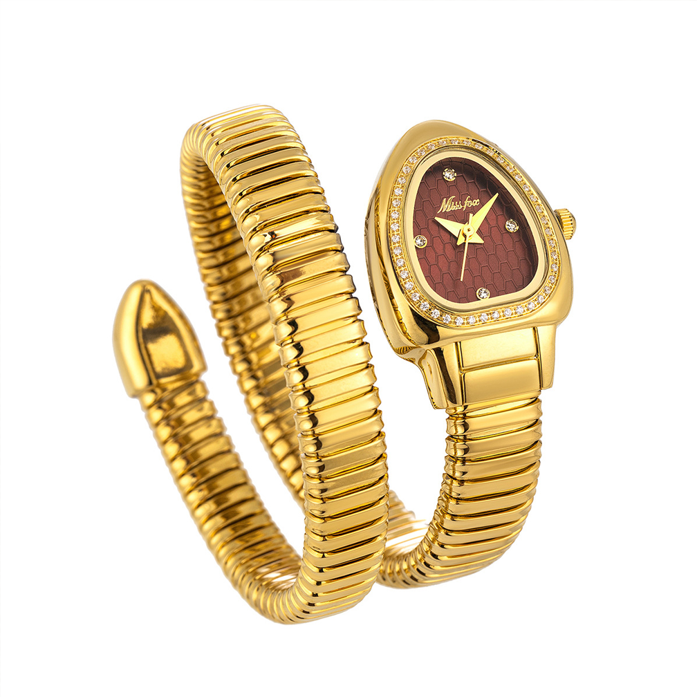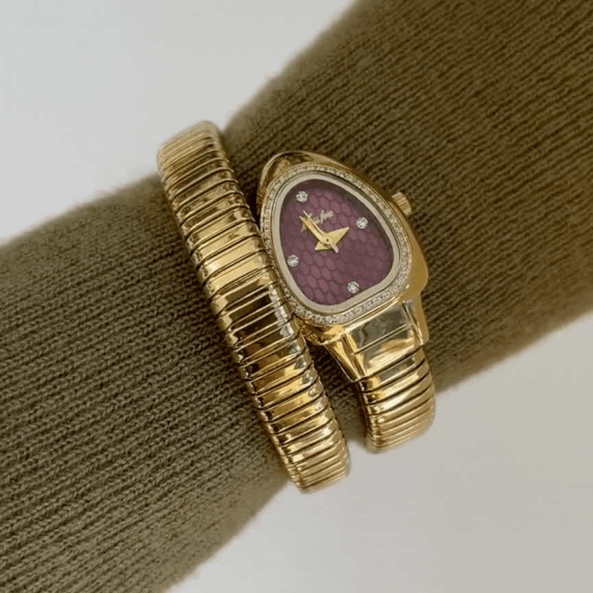 Questo audace orologio al quarzo da donna avvolge il polso in una forma scultorea bracciale color oro, portando ad un sorprendente cassa rossa a forma di testa di serpente e un accattivante quadrante con motivo a pelle di serpenteÈ un pezzo che sfuma il confine tra gioiello e orologio, progettato per catturare l'attenzione e trasmettere sicurezza.
