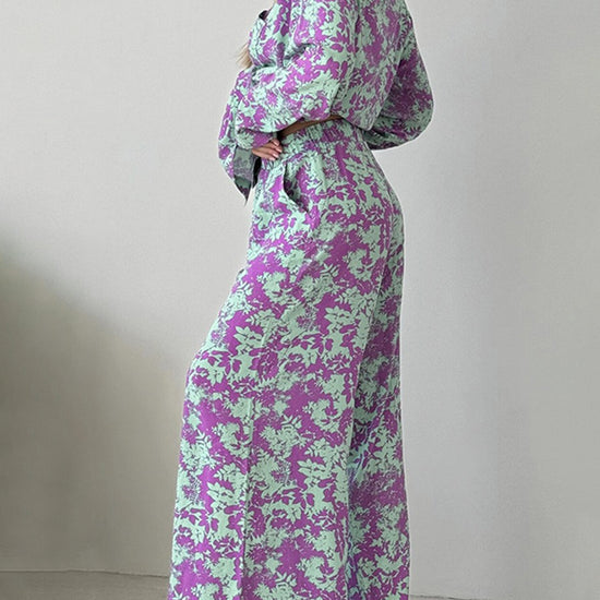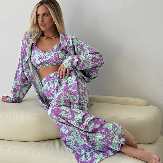 Elevate your downtime with this coordinated and chic ensemble. This versatile collection features a supportive cropped bralette, a relaxed-fit long-sleeve top with a classic collar, and matching high-waisted wide-leg trousers. Designed with a vibrant botanical pattern, these pieces offer a fresh and feminine look that transitions perfectly from a cozy morning at home to a relaxed resort afternoon. The lightweight fabric provides a soft touch and effortless movement for all-day comfort.
