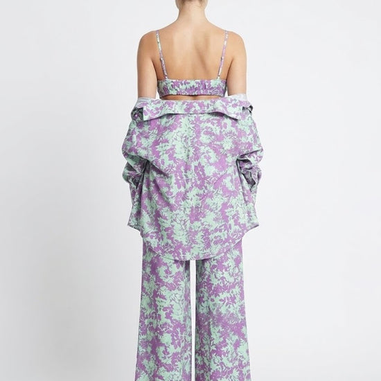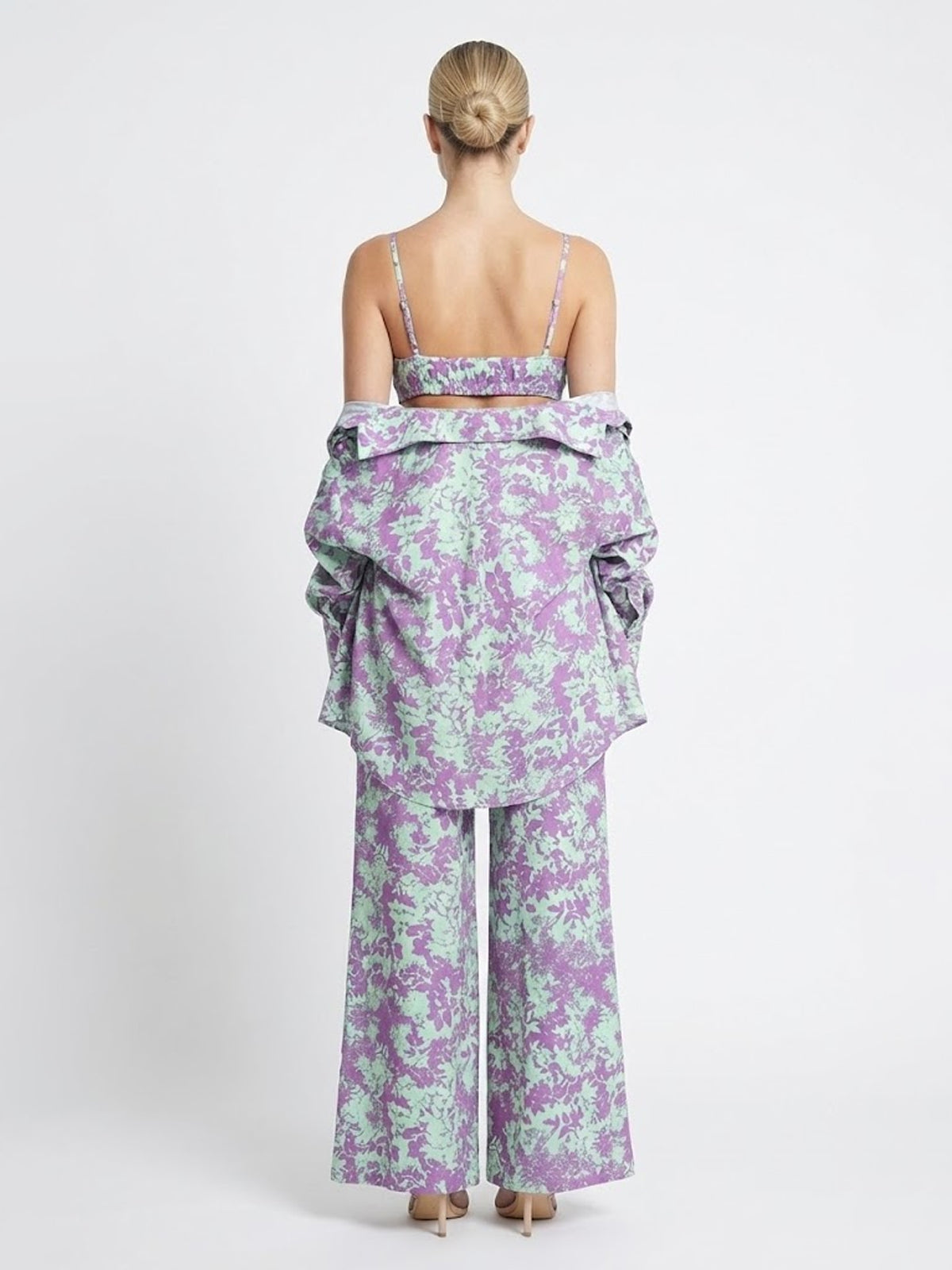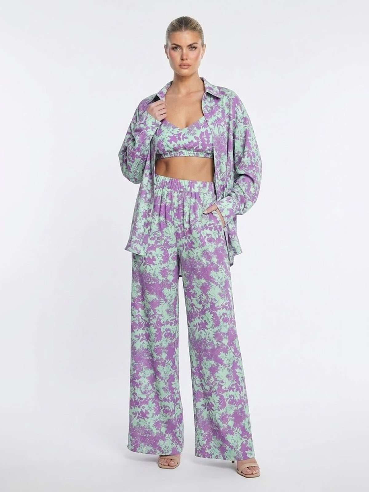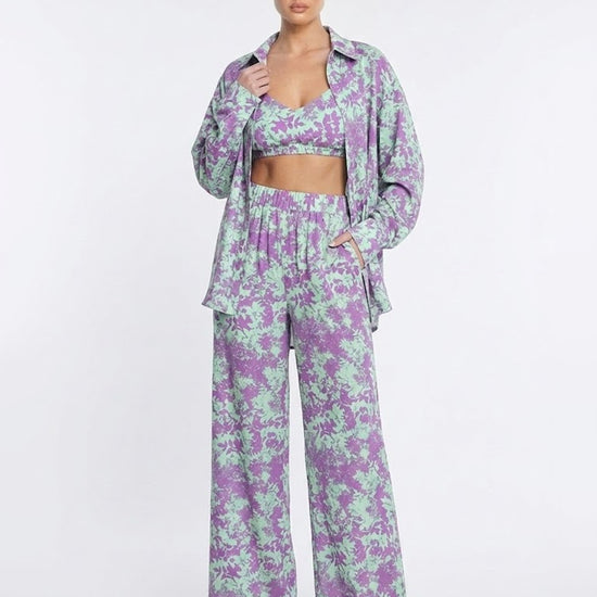Three-Piece Floral Lounge Set | Bralette, Button-Down & Wide Leg Trousers