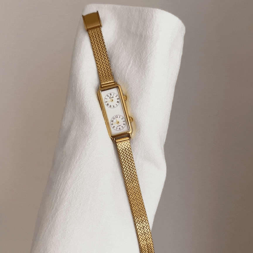 Embrace elegance on every journey with this women’s quartz watch. Featuring a refined gold wheat-pattern strap, a sleek rectangular case, and dual white dials, this timepiece blends sophistication with practical style. Perfect for travel, work, or evening occasions, it’s a versatile accessory that reflects both elegance and adventure.