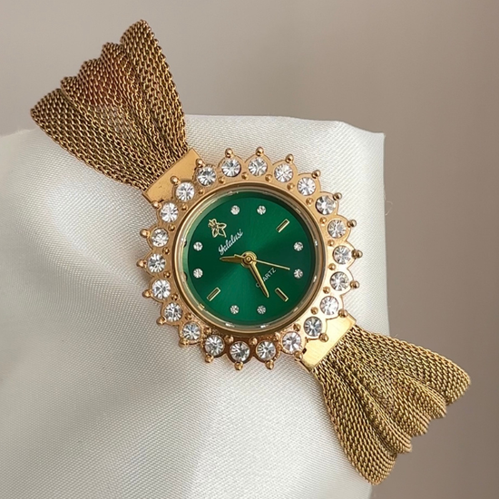 Inspired by vintage floral charm, this watch features a green sunburst dial framed by a diamond-set sunflower bezel and a delicate gold mesh bracelet. Reliable quartz ensures precision, while scratch and water resistance preserve its romantic allure. Effortlessly transitioning from day to evening, it serves as a captivating accessory—ideal as a cherished gift or personal indulgence in timeless, nature-inspired elegance.