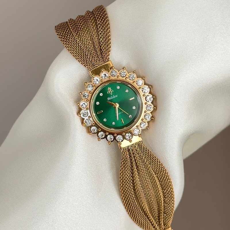 Vintage Green Dial Watch: Gold Sunflower Diamond Bezel & Mesh Bracelet, Quartz