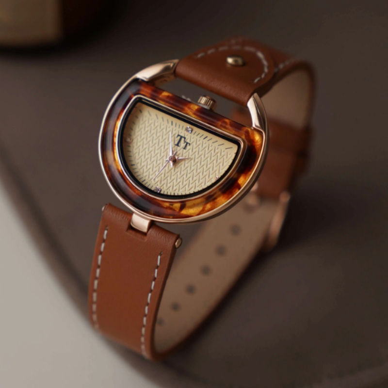 Amber Eclipse-uurwerk: lederen halve maan kwartshorloge