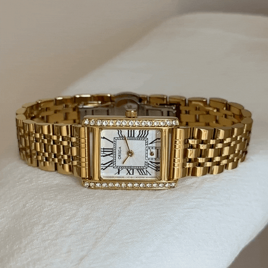 Aura Rectangle - Gold Bracelet Watch with White Dial & Crystal Accents