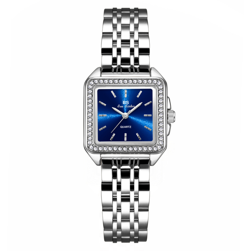 Azure Square – Modern Silver Stainless Steel Women’s Quartz Watch with Blue Dial and Crystal-Set Case