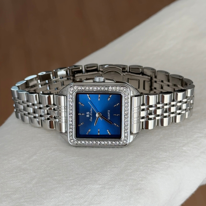 The Azure Square watch embodies modern elegance with a minimalist twist. Crafted with a polished silver stainless-steel band and a square crystal-accented case, it highlights a vivid blue dial that adds a touch of sophistication and calm confidence. Perfectly balancing shine and subtlety, this timepiece complements any outfit — from tailored workwear to evening attire.