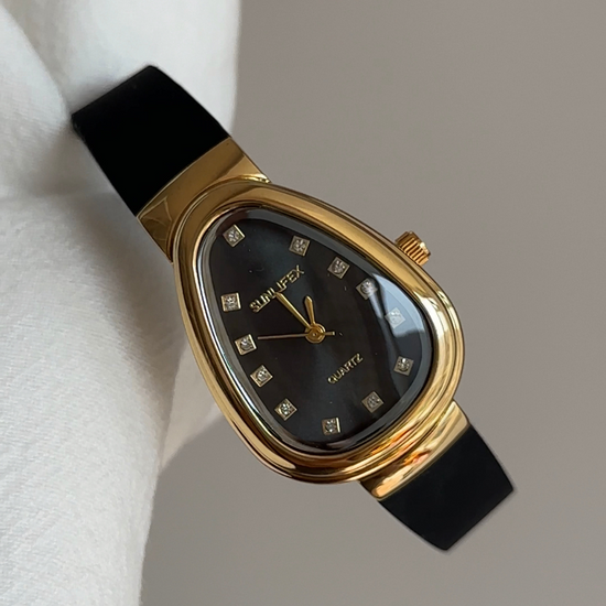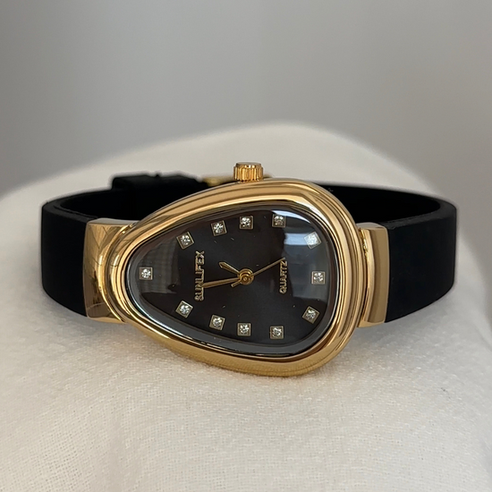 Unique women’s quartz watch with black silicone strap, gold snake head case, and diamond-set black dial, exuding vintage luxury and bold elegance.
