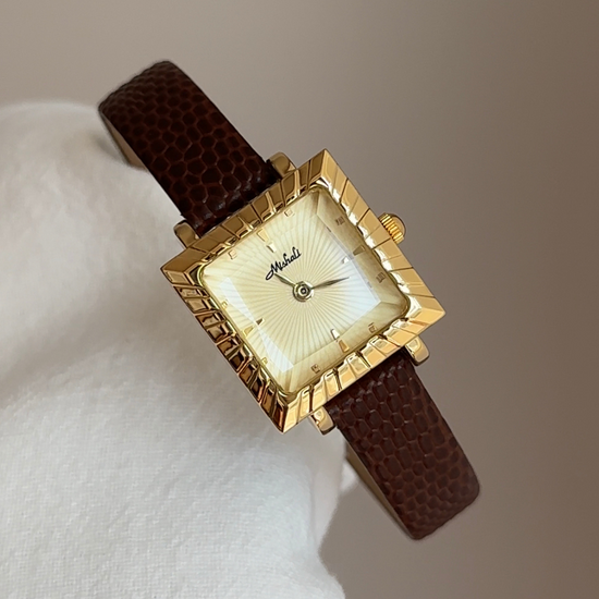 Elegant women’s quartz watch with slim brown leather strap and gold candy-square dial, offering a refined vintage charm for daily wear.