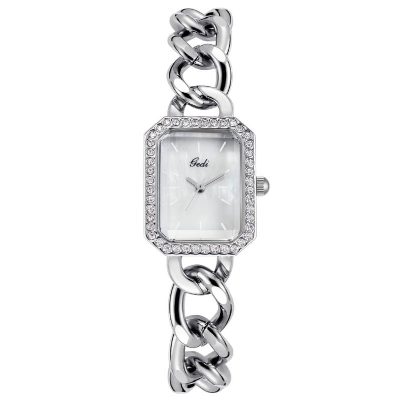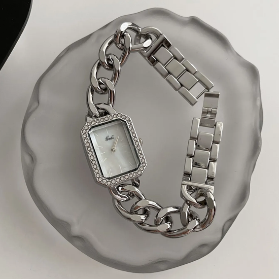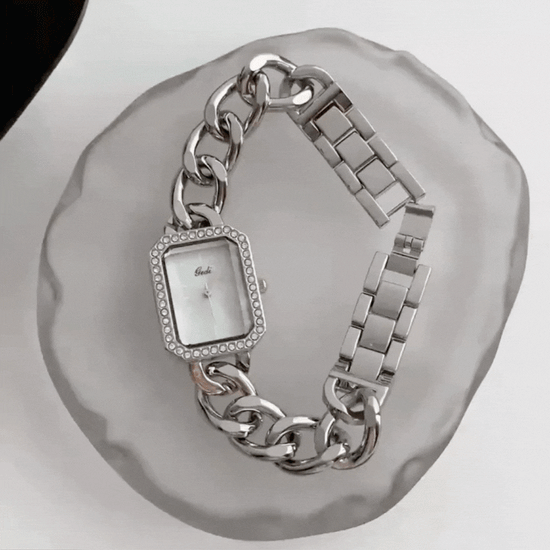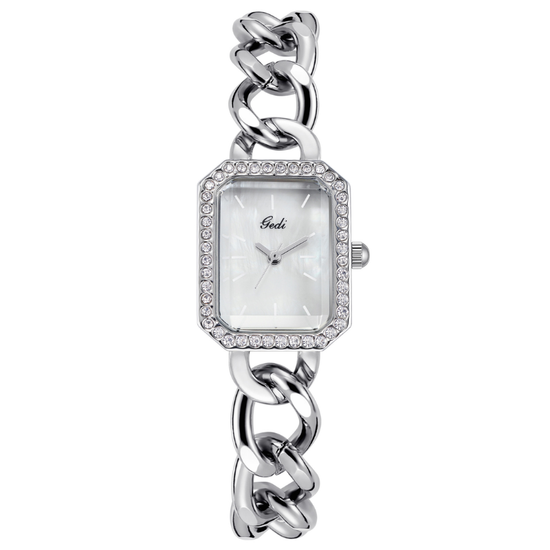 Dit quartzhorloge voor dames is voorzien van een verfijnde rechthoekige witte wijzerplaat, delicaat omlijnd met sprankelende kristallen accenten, gepaard met een strakke zilveren armband voor een juweelachtige afwerking. Het ontwerp is geïnspireerd op de klassieke 'bouclé chic'-esthetiek: strak, vrouwelijk en onmiskenbaar tijdloos.